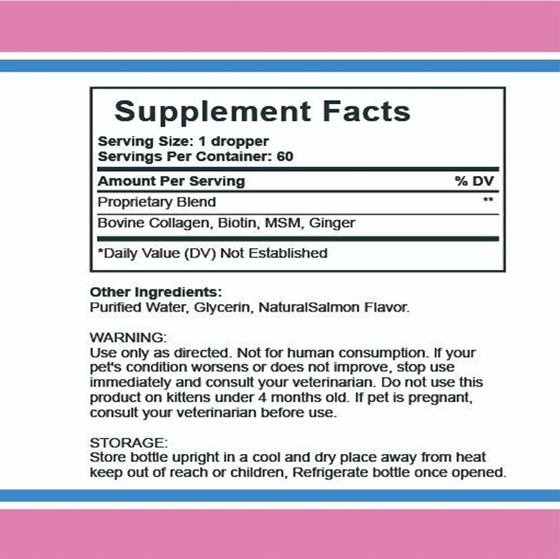 Product information:Specifications: 60 ml Keywords: Pet Care Capacity: 60 ml Weight: 146 g Flavor: Salmon Ingredients: Purified water, glycerin, natural salmon flavoring. Packing list: Collagen drop...