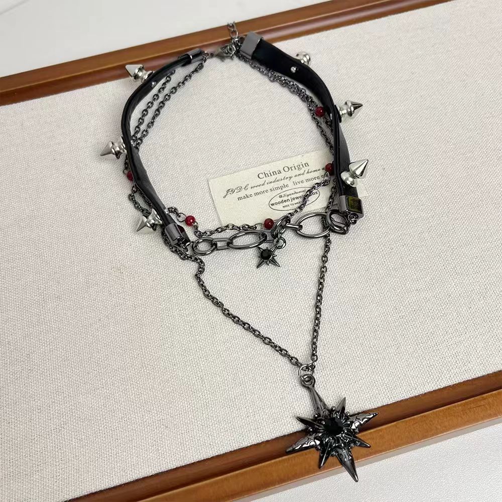 Dark Glittering Star Pendant Rivet Leather Necklace