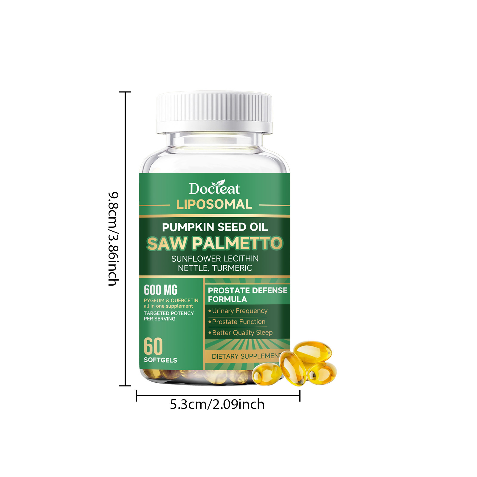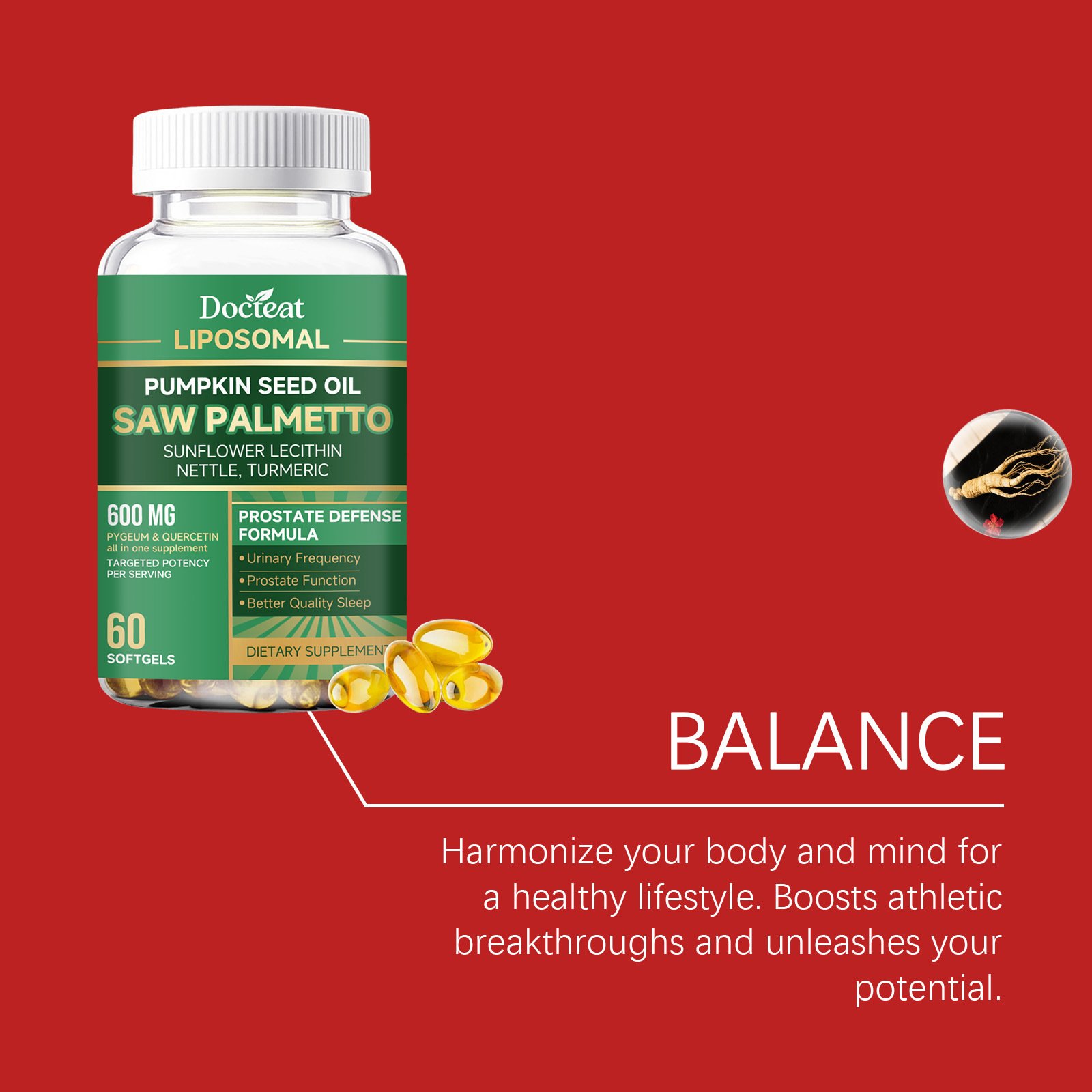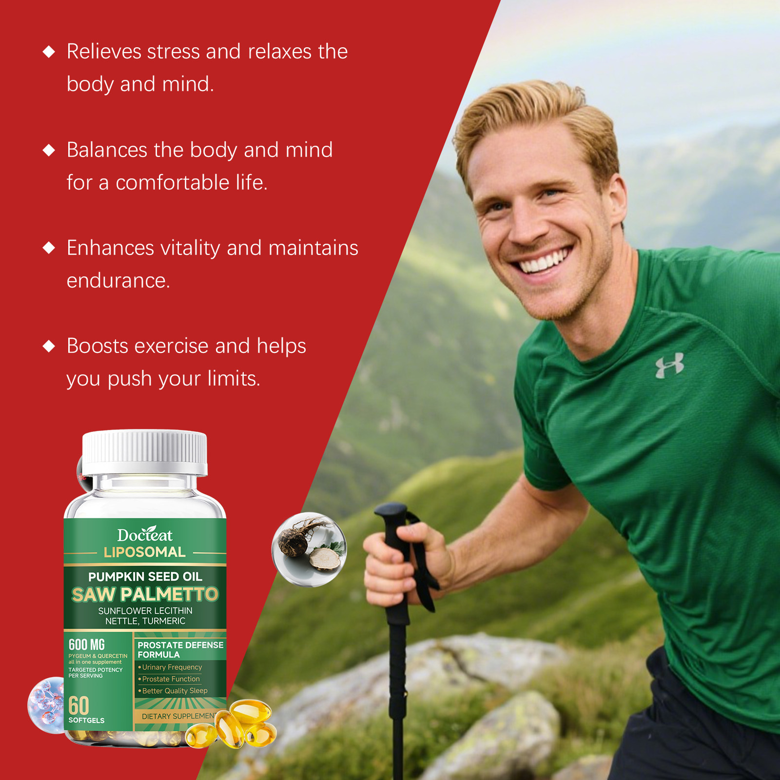 Ingredients: vitamin C, zinc, pumpkin seed oil, saw palm fruit extract, turmeric root extract, sunflower lecithin extract, nettle root extract, African thorn plum bark extract, quercetin.