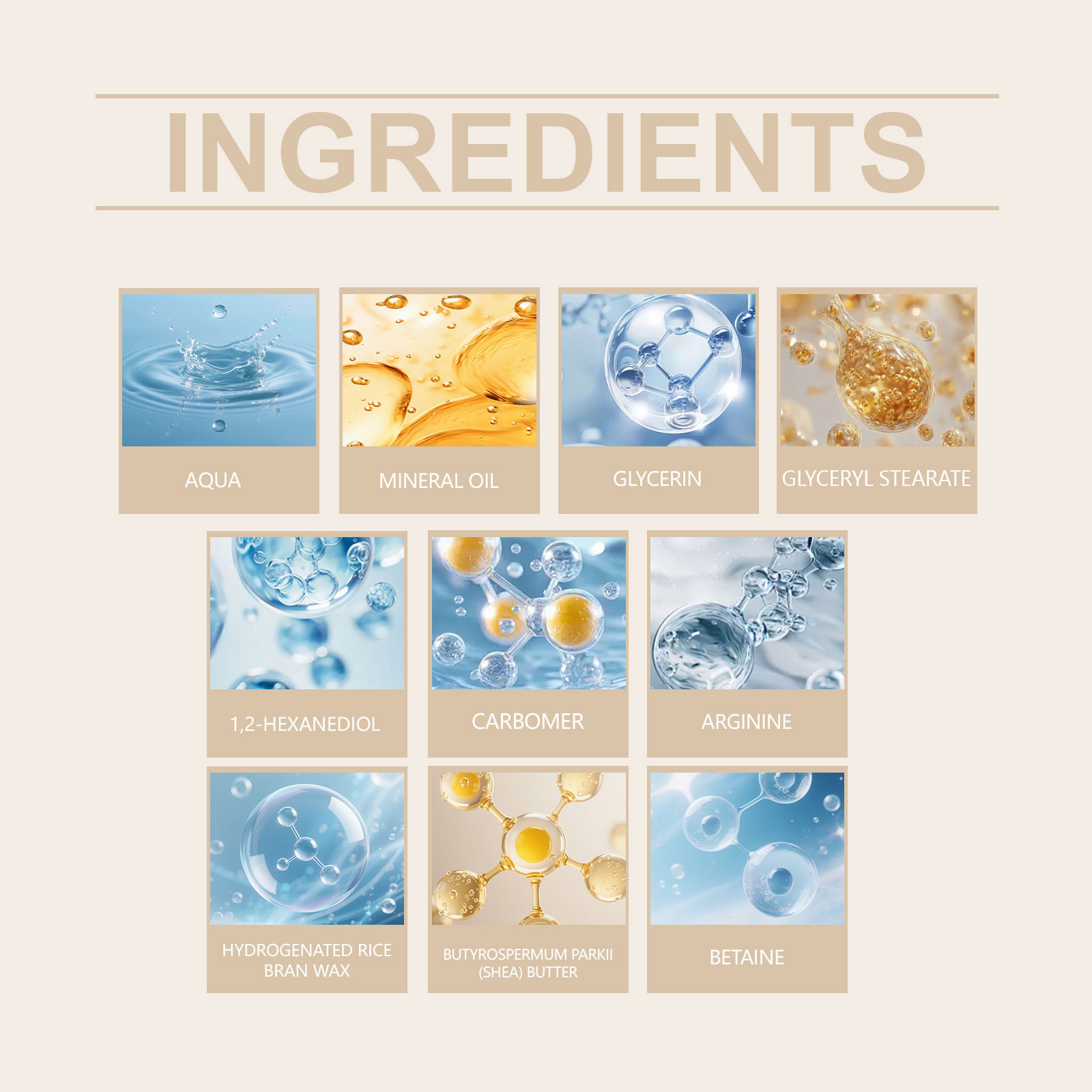 Ingredients: water, mineral oil, glycerin, glycerol stearate, 1,2-hexanediol, carbomer, arginine, hydrogenated rice bran wax, shea butter, betaine.