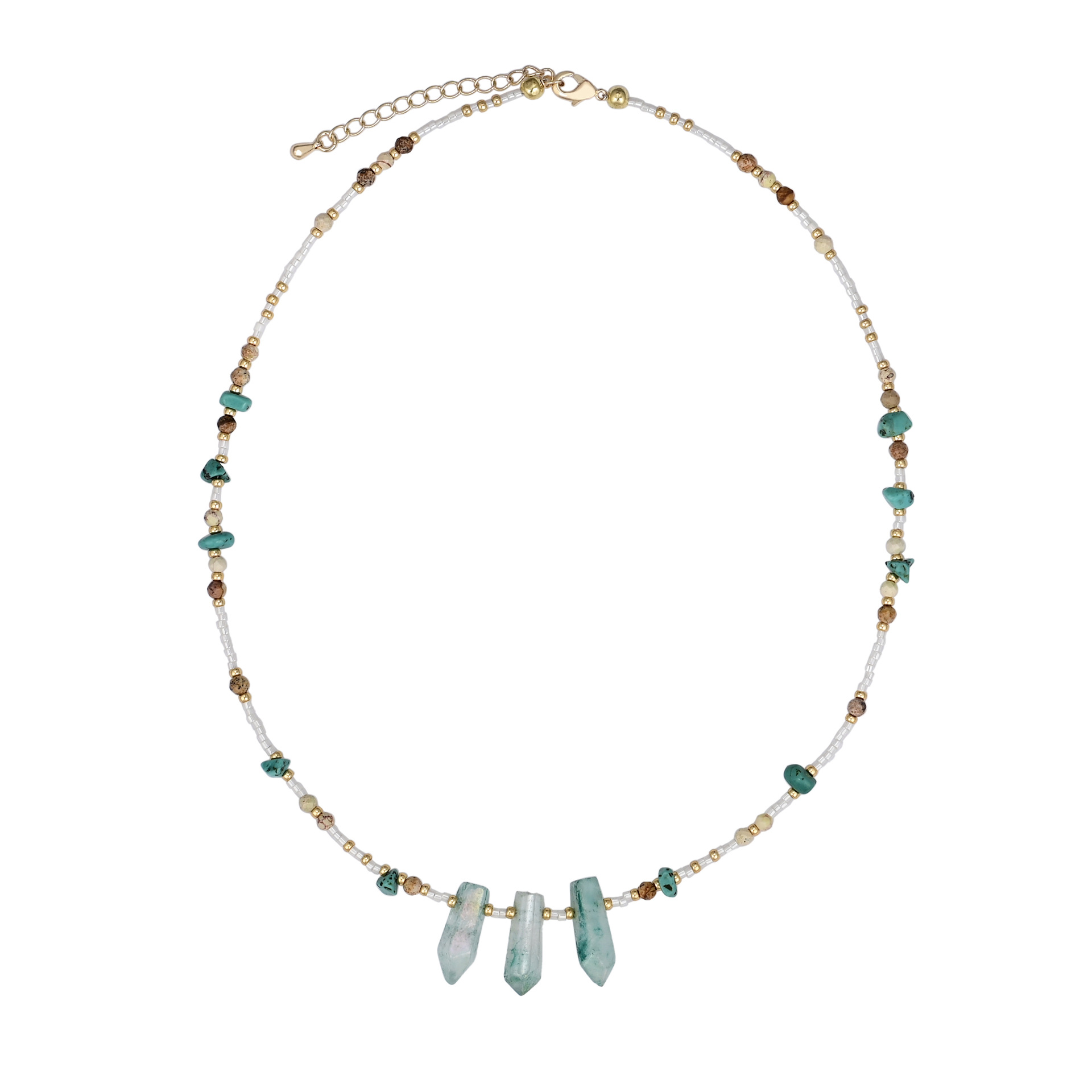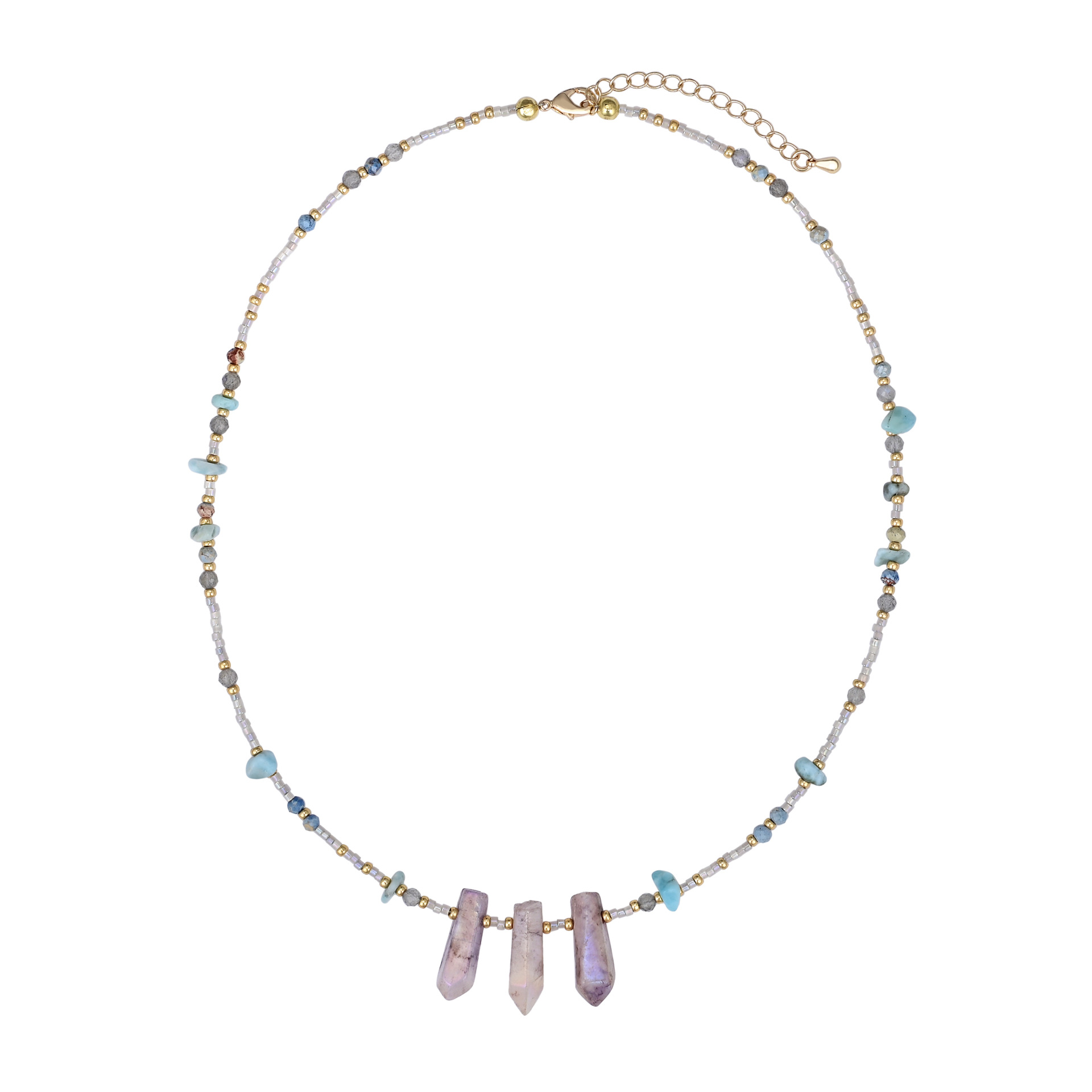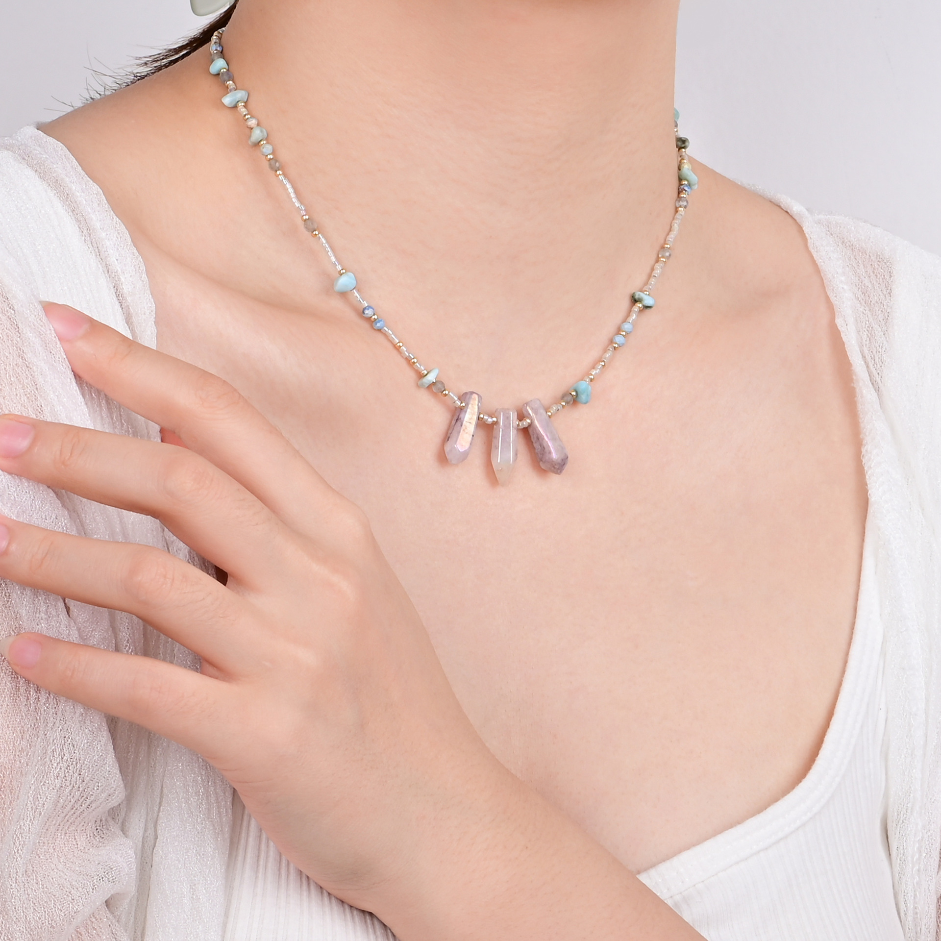 Colors: Pink crystal pillar necklace, green crystal pillar necklace, purple crystal pillar necklace