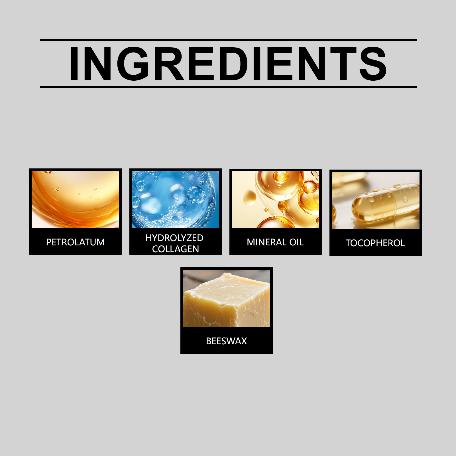 Ingredients: mineral oil, beeswax, petrolatum, tocopherol (vitamin E), hydrolyzed collagen.