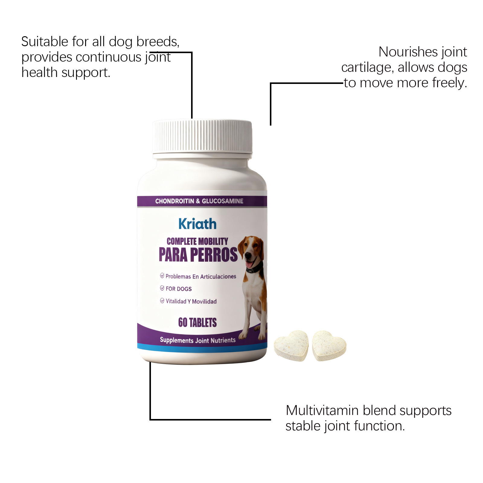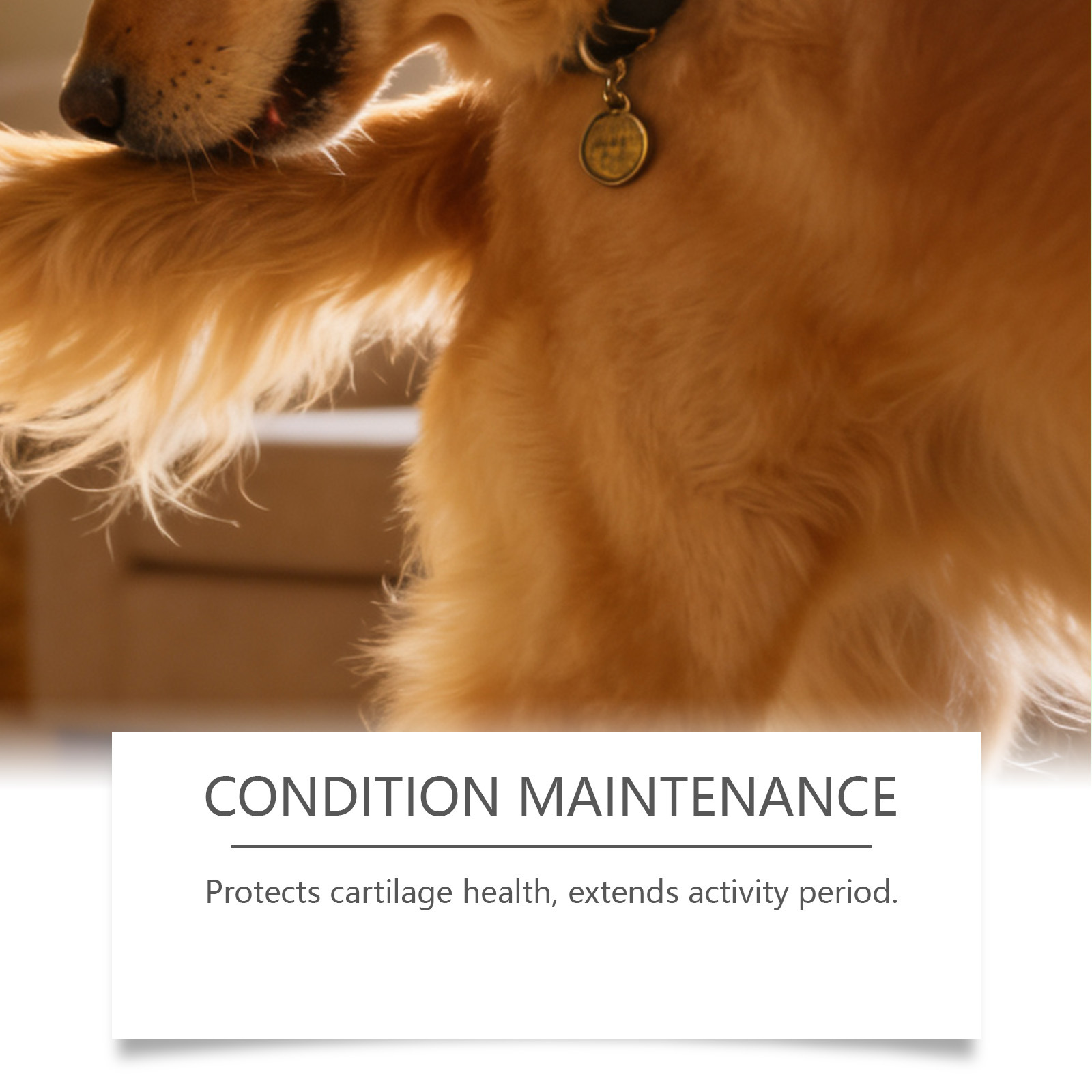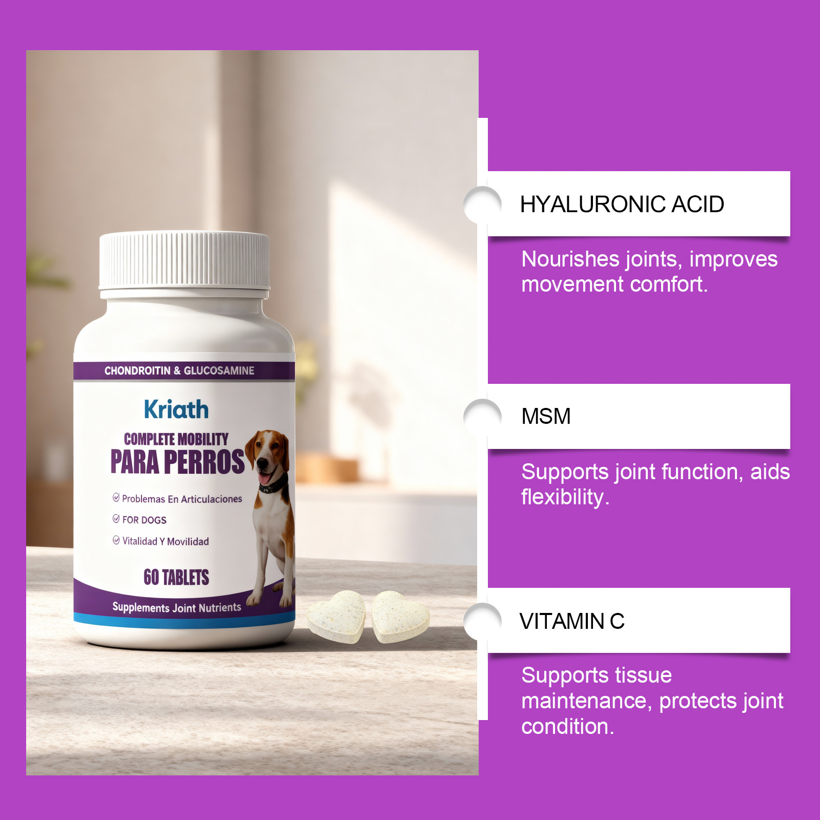 Ingredients: glucosamine, chondroitin sulfate, methylsulfonylmethane, collagen, hyaluronic acid, L- ascorbic acid, dl-α- tocopherol acetate, nicotinic acid, pantothenic acid, thiamine hydrochloride, riboflavin, vitamin A acetate, folic acid, D- biotin and vitamin D3.