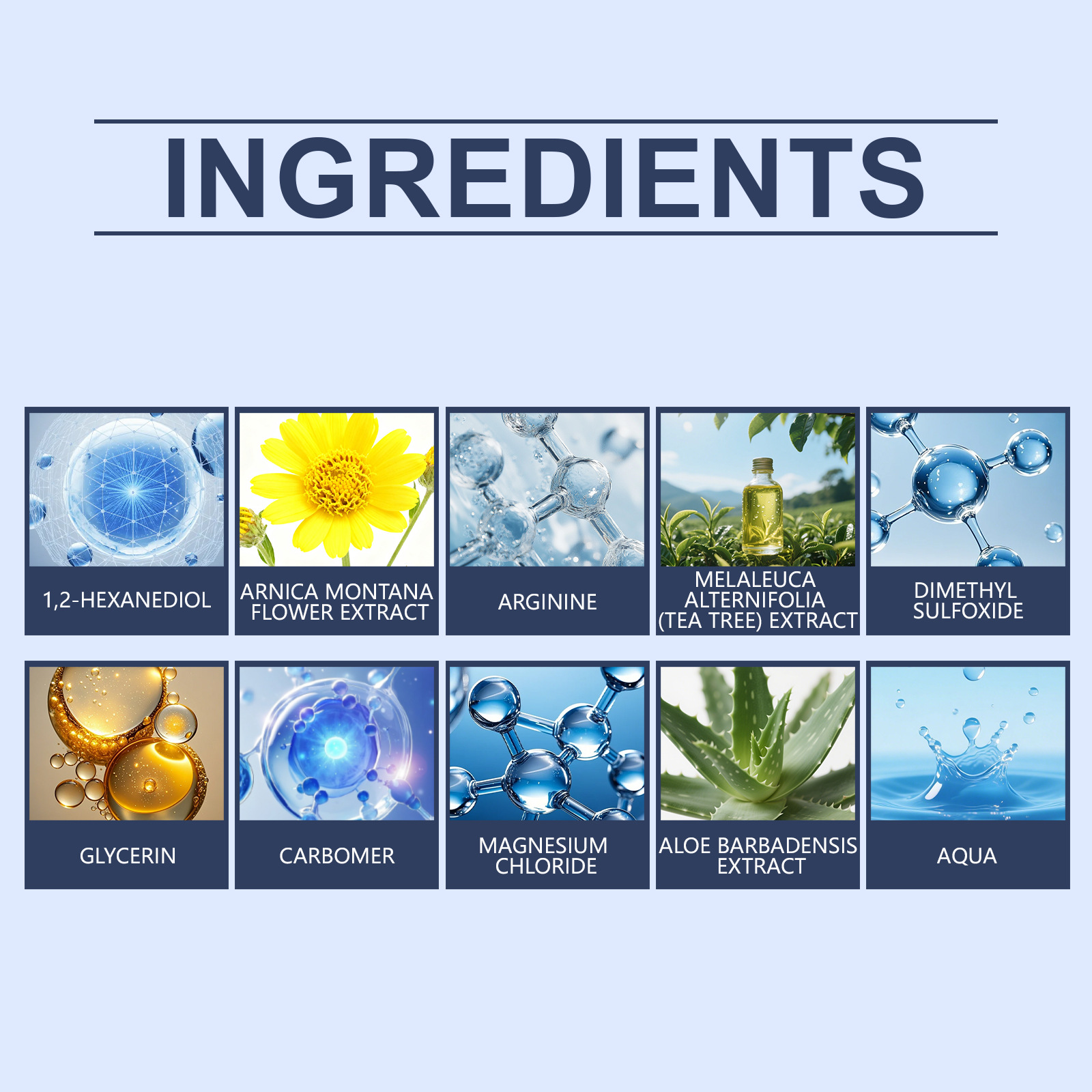 Active Ingredients: Dimethyl sulfoxide, arnica flower extract, melaleuca alternifolia leaf extract, aloe barbadensis leaf extract, magnesium chloride