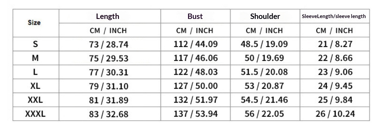 Sizes: S, M, L, XL, XXL, XXXL