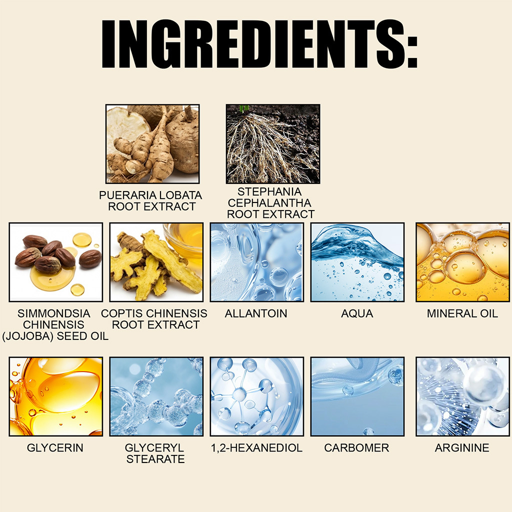 Ingredients: water, mineral oil, glycerin, glyceryl stearate, 1,2- hexanediol, carbomer, arginine, allantoin, pueraria lobata extract, Cynanchum chinense root extract, jojoba seed oil and coptis root extract.