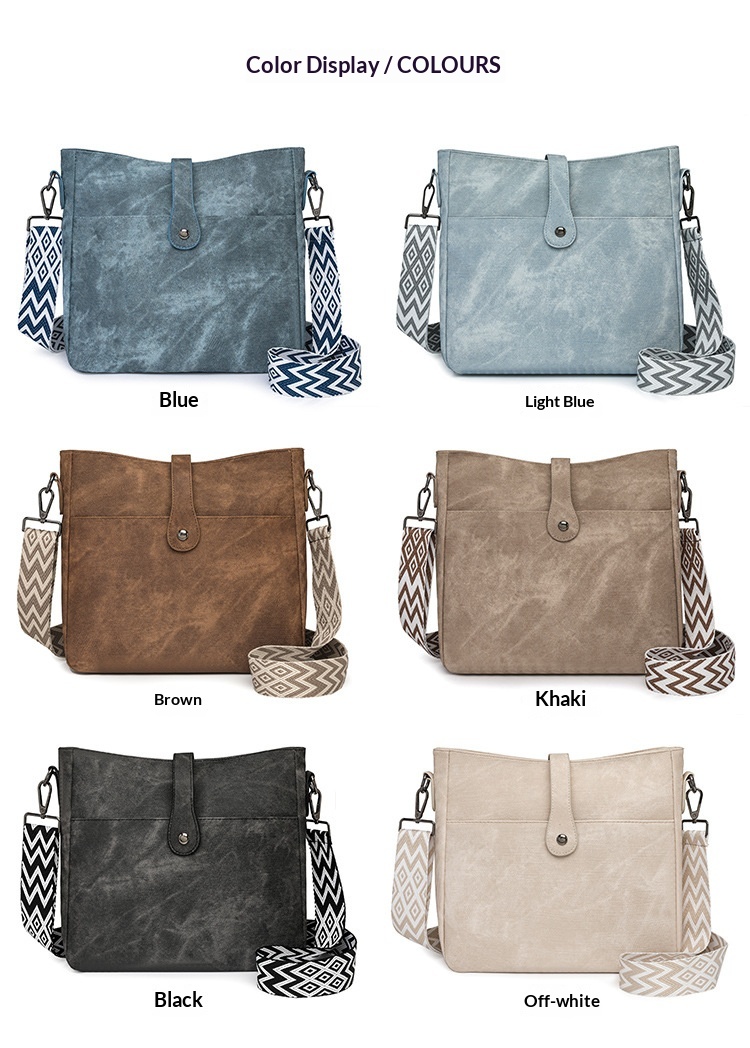 Colors: Blue, light blue, brown, khaki, black, off-white