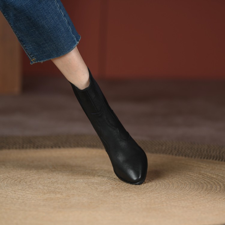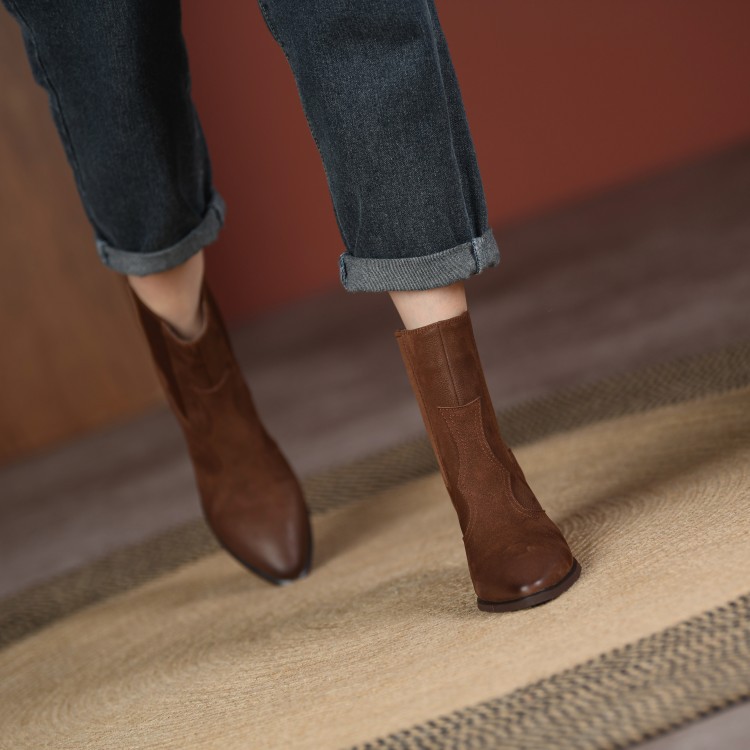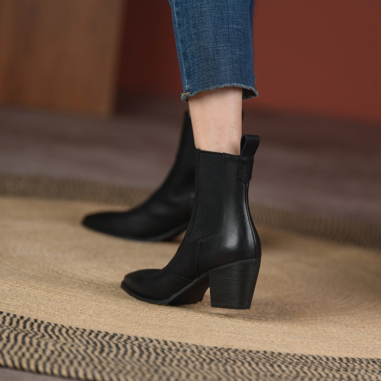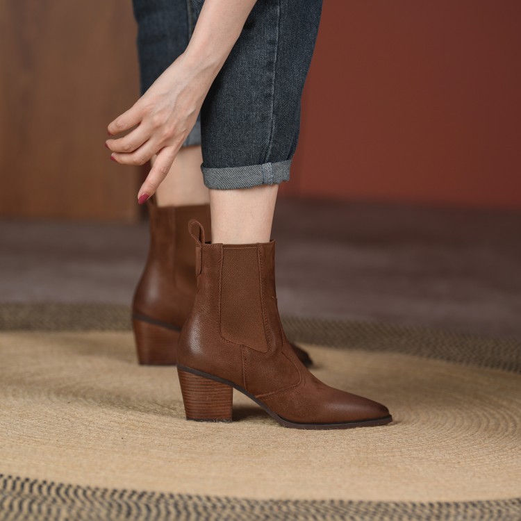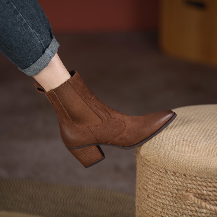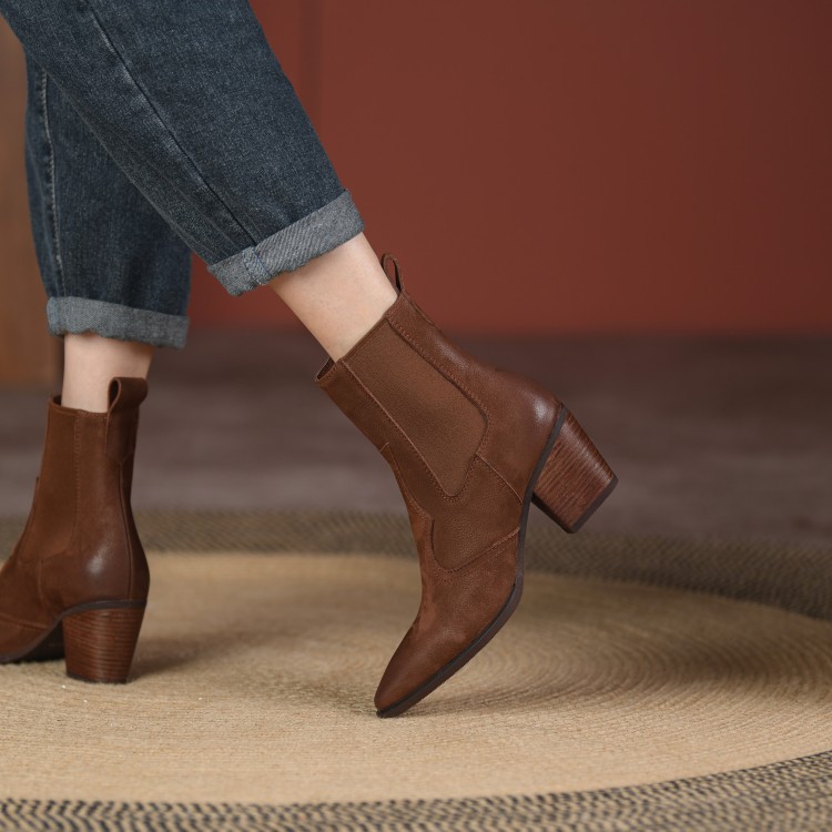 Womens Retro Pointed-toe Ankle Boots With Elastic Band And Chunky Heel