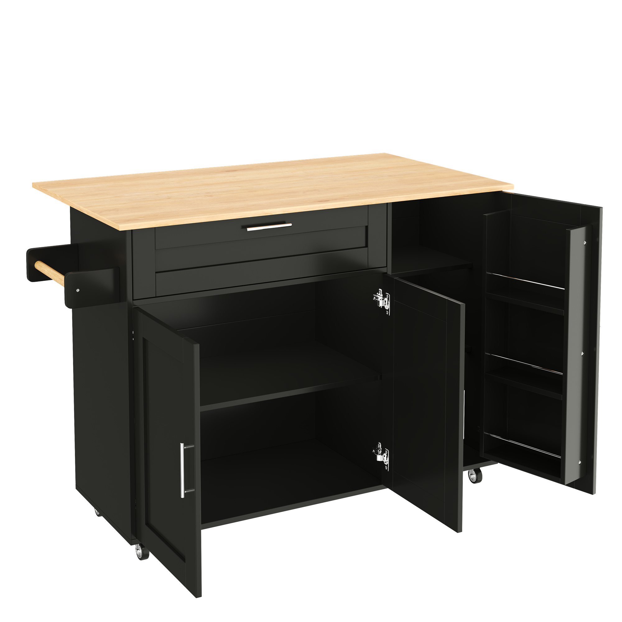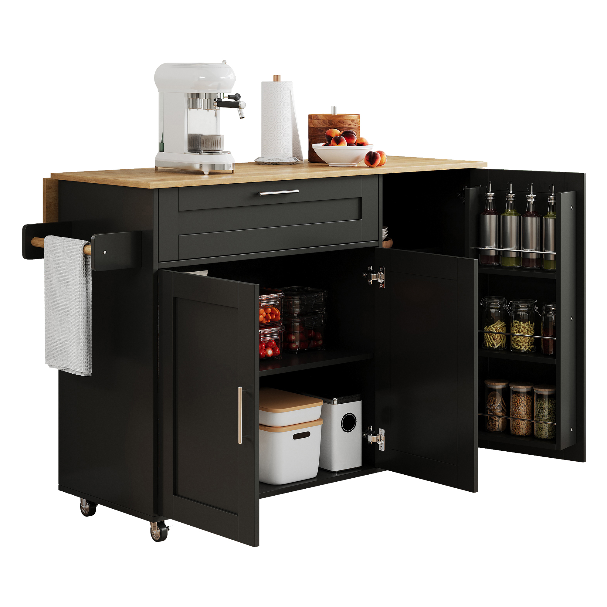 Product Name:132.5*44(70)*90cm Kitchen Island on Wheels, Rolling Storage Trolley with Foldable Tabletop, multifunctional cabinet, spice rack, towel holder, 5 wheels, suitable for kitchen/dining/house