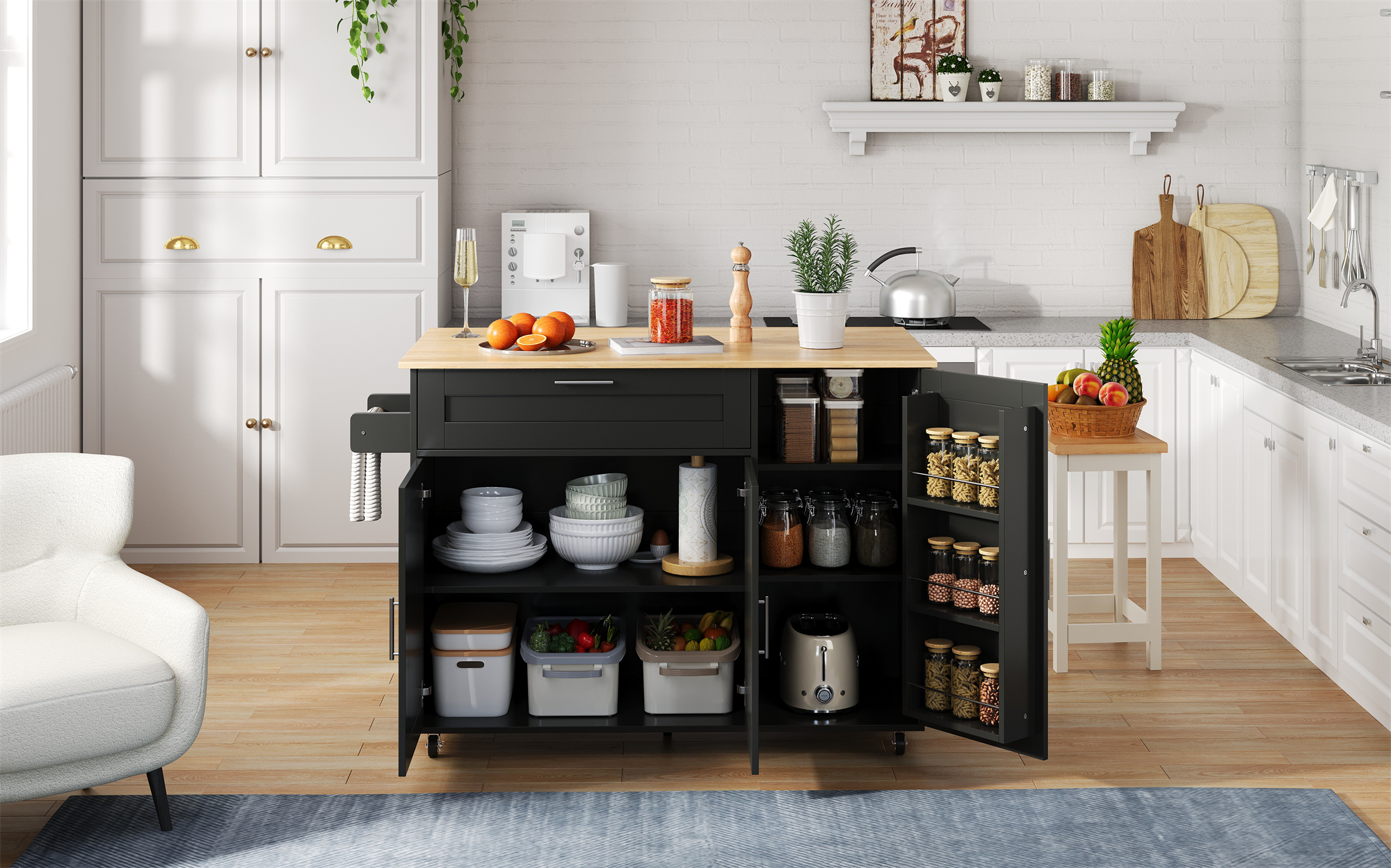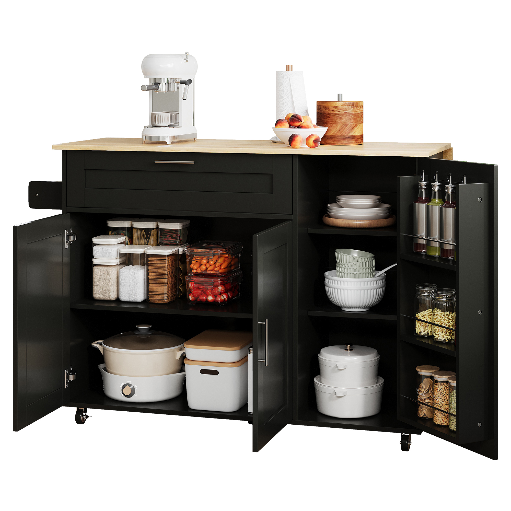 - Versatile storage solutions: (1) Large upper-left drawer: Equipped with smooth, quiet sliding rails, perfect for cutlery or kitchen tools. (2) Spacious compartment below: Features an adjustable shelf, suitable for a microwave, coffee maker, or other small appliances; the double-door design ensures easy access. (3) Right storage area: Includes two adjustable shelves inside and three spice racks on the door—ideal for seasonings and kitchen essentials.