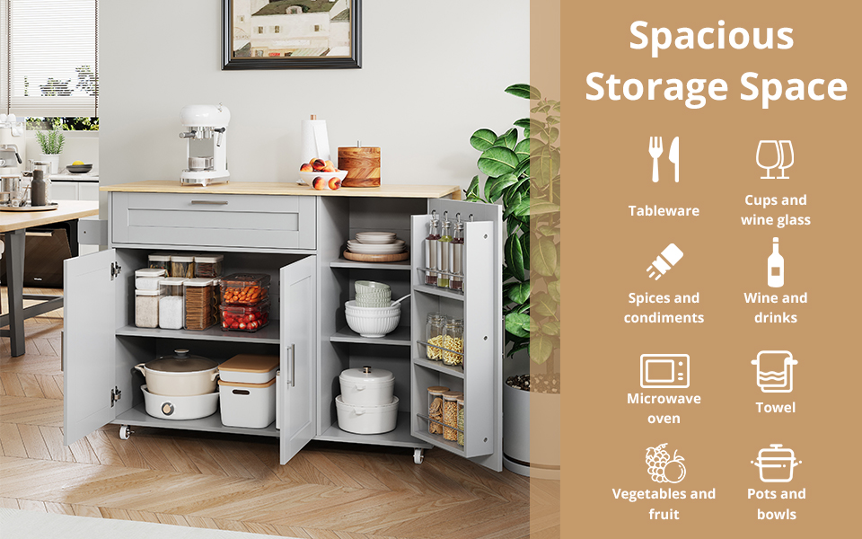 - Versatile storage solutions: (1) Large upper-left drawer: Equipped with smooth, quiet sliding rails, perfect for cutlery or kitchen tools. (2) Spacious compartment below: Features an adjustable shelf, suitable for a microwave, coffee maker, or other small appliances; the double-door design ensures easy access. (3) Right storage area: Includes two adjustable shelves inside and three spice racks on the door—ideal for seasonings and kitchen essentials.