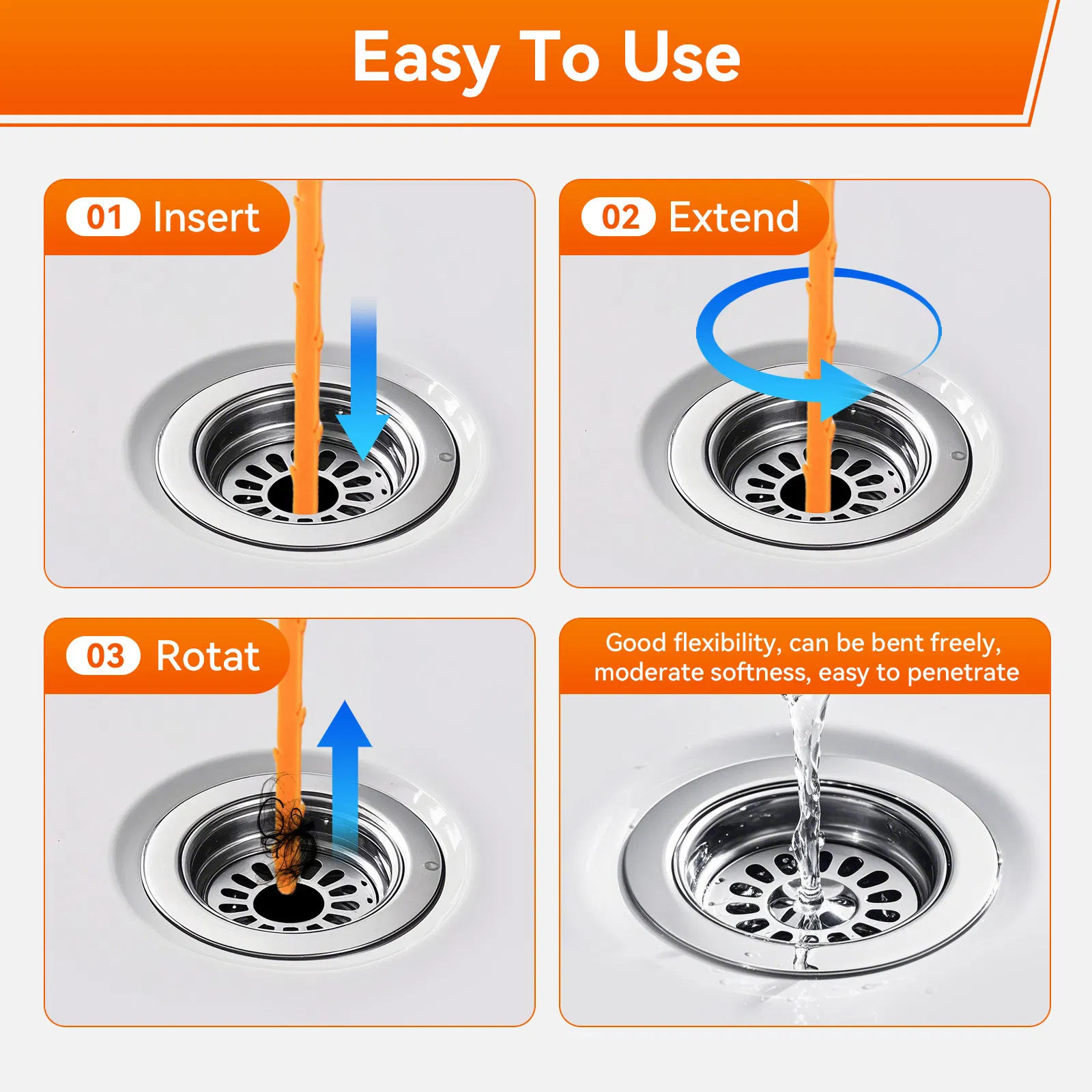 - Pipe Cleaning Device: With a spiral diameter of 6.0 mm and a length of 7.6 m, it is suitable for clearing common pipe blockages caused by hair, paper, wet wipes, food residues, grease, etc.