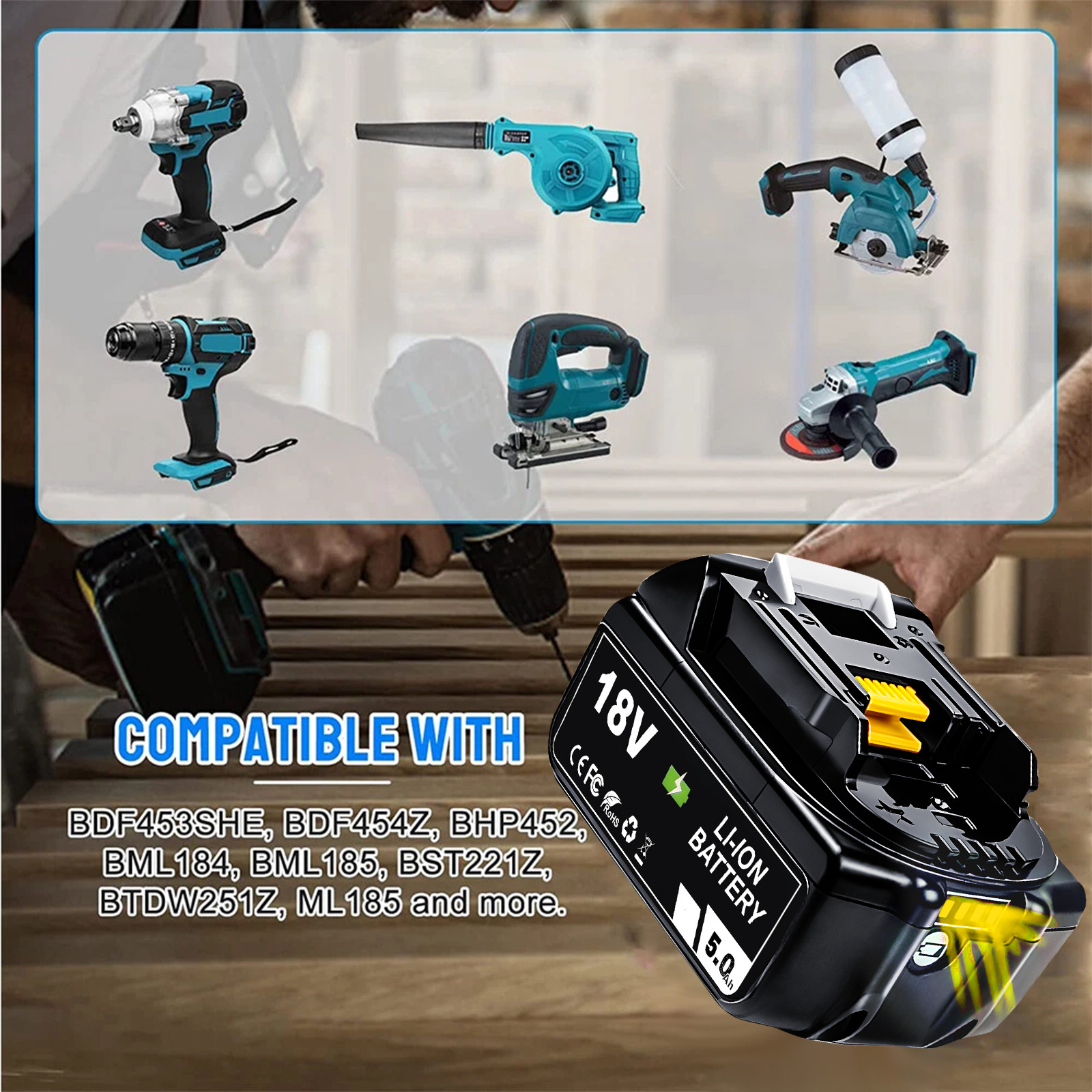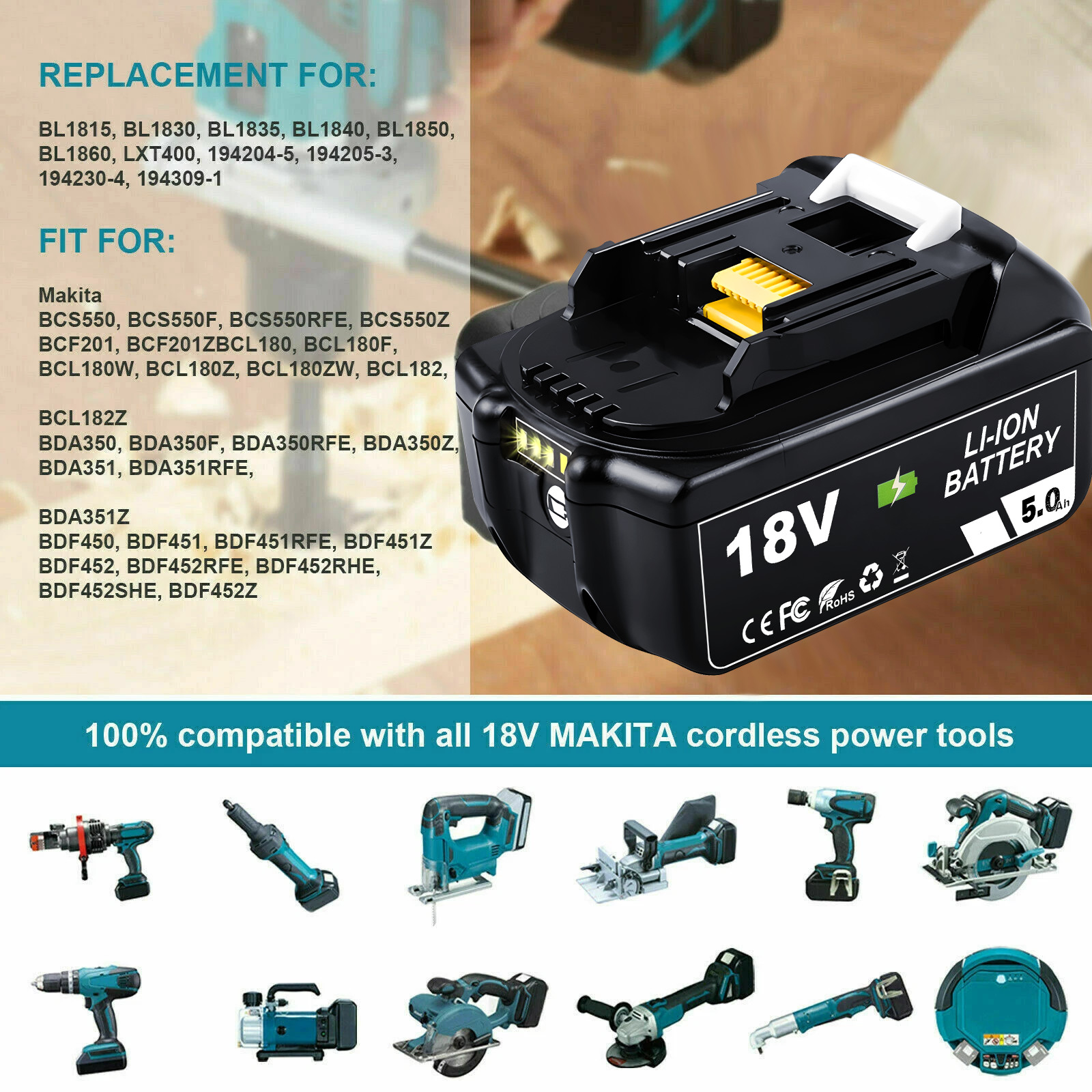 7. It is suitable for Makita BL1815, BL1830, BL1835, LXT400, 194204-5, 194205-3, 194309-1.