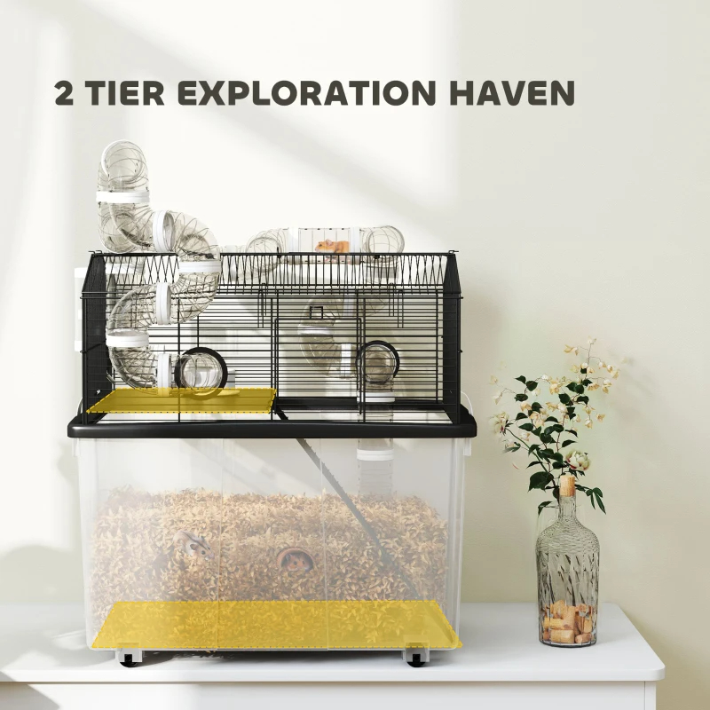2 Tier Hamster Cage With 12 Deep Tray, Tube System, Water Bottle, Ramp, Feeding Bowl, Black