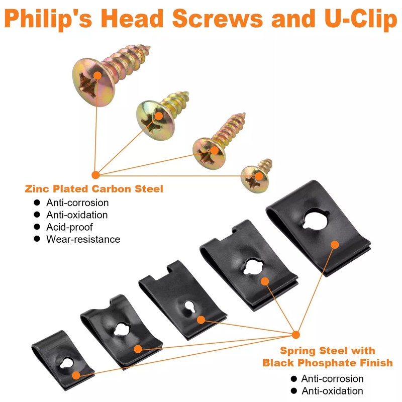 85-PCS 5 sizes U-Clips(3mm to 6mm) with black phosphate finish, will be less prone to getting rust. Durable and fit perfect with Philips's head screws.