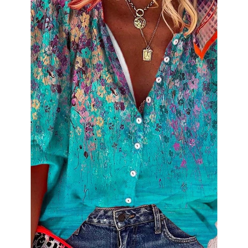 3D Floral-print Long-sleeve Top Fashionable V-neck Blouse For Women