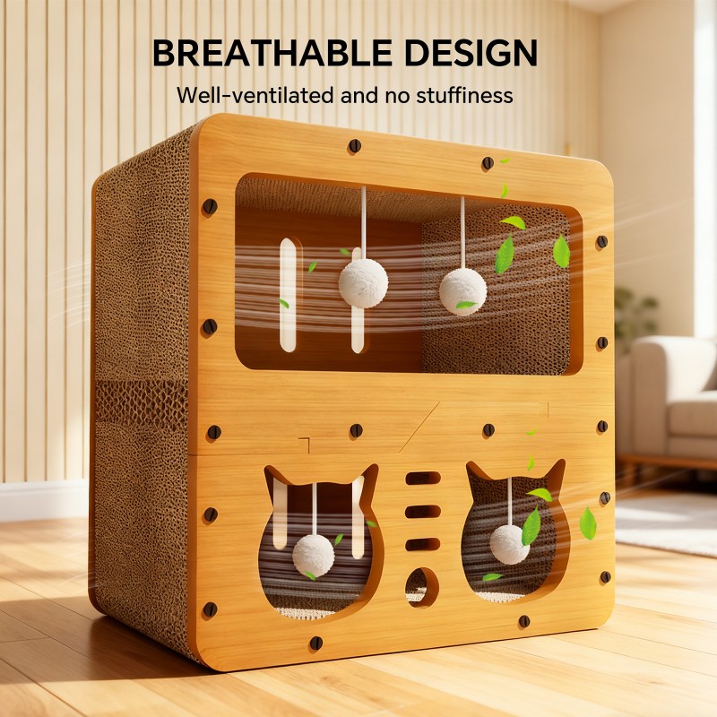 45cm Double Layer Double Cat Head Cat Scratcher Sofa, With 4 Teaser Balls, Wood -Corrugated Scratcher, Cat Claw Care & Resting Toy