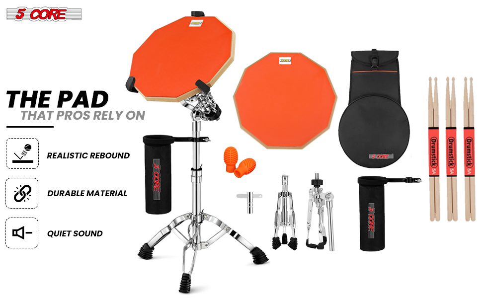 5 Core Drum Practice Pad Set 12" Adjustable Snare Drumming Stand Double Sided Silent Drummer Kit - DPAD COMBO ORG