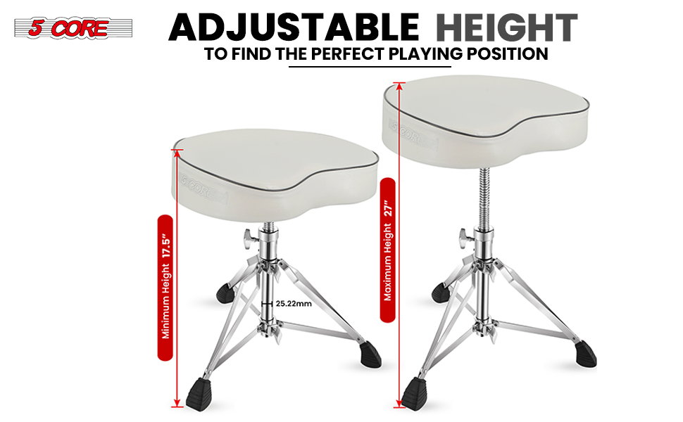 Product DescriptionExperience amazing comfort with our thick padded drum throne, featuring a 4 inch high-density soft sponge seat in back and 3.5 inch in front. The swivel height adjustable mechanism lets you rotate the seat 360 degrees. Adapts easily to different drumming setups and techniques. Height can also be changed from 17.5 to 27 inches, accommodating both adults and kids and supporting up to 441 lbs.