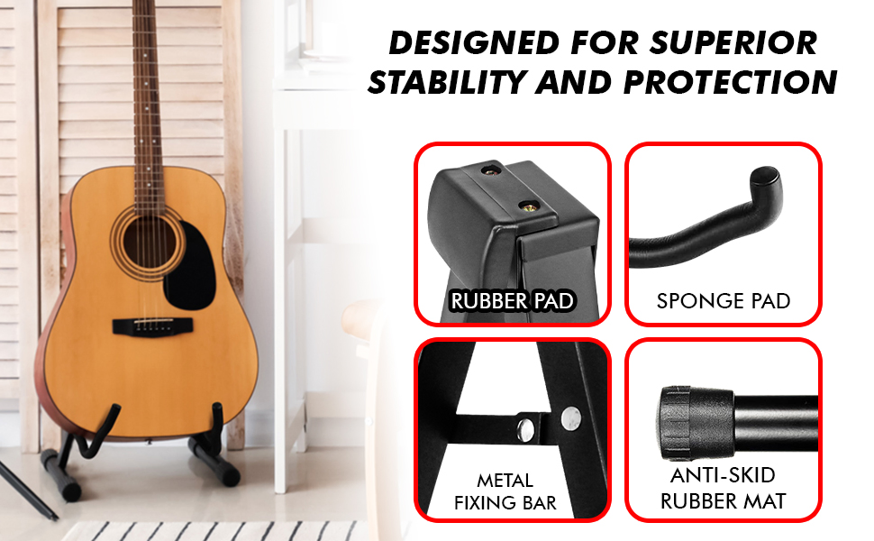 This heavy-duty A frame metal guitar stand floor offers unmatched stability and durability with its thick steel construction and reinforced welded joints. Adjustable to fit acoustic, electric, ukulele, and bass guitars, this guitar support features soft padding to protect against scratches and dents.