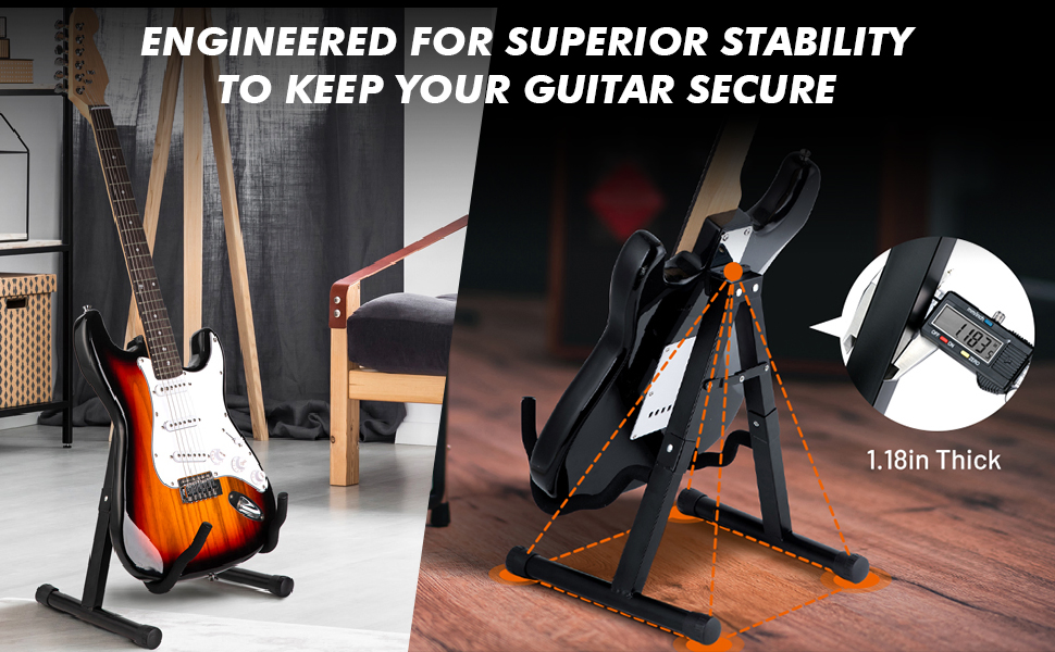 Built from heavy duty metal to be sturdy and stable, our stand securely holds your guitar without tipping over. It’s designed to last.