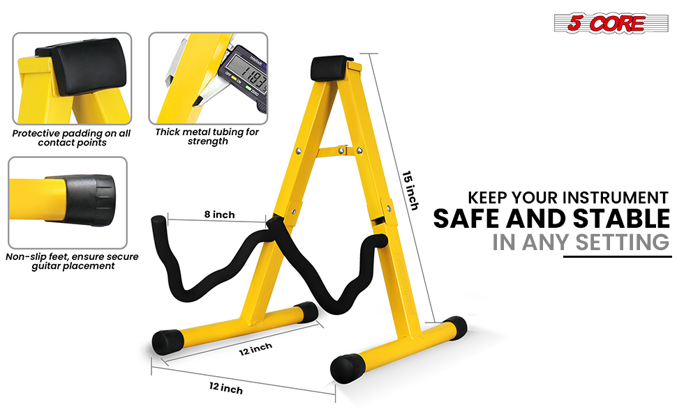 This heavy-duty A frame metal guitar stand floor offers unmatched stability and durability with its thick steel construction and reinforced welded joints. Adjustable to fit acoustic, electric, ukulele, and bass guitars, this guitar support features soft padding to protect against scratches and dents.