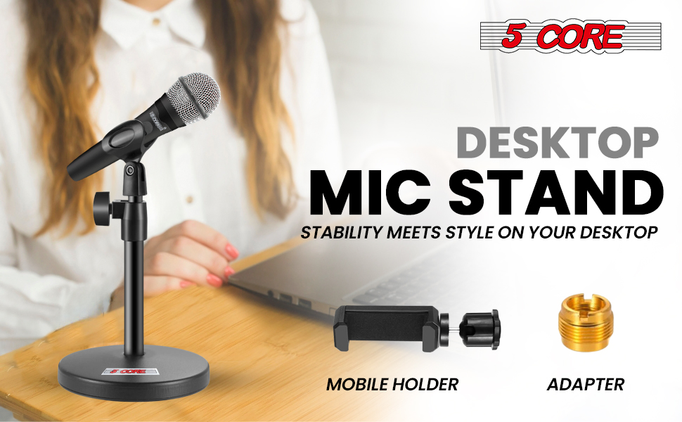 Product DescriptionThe 5 Core Desk Microphone Stand is a sturdy, adjustable, and multifunctional solution for creators, musicians, and professionals. Featuring a 5" round base, it ensures stability and prevents tipping. The metal tube construction provides durability, supporting dynamic, USB, and handheld microphones with ease. Height adjusts from 10" to 13.5", making it perfect for podcasting, recording, livestreams, and conferences. Swap clips to use it as a mic stand desk or phone holder for 2"-5" devices. Compatible with Blue Yeti, Snowball, and more. A versatile desktop microphone stand built for performance and convenience. Great value for money!