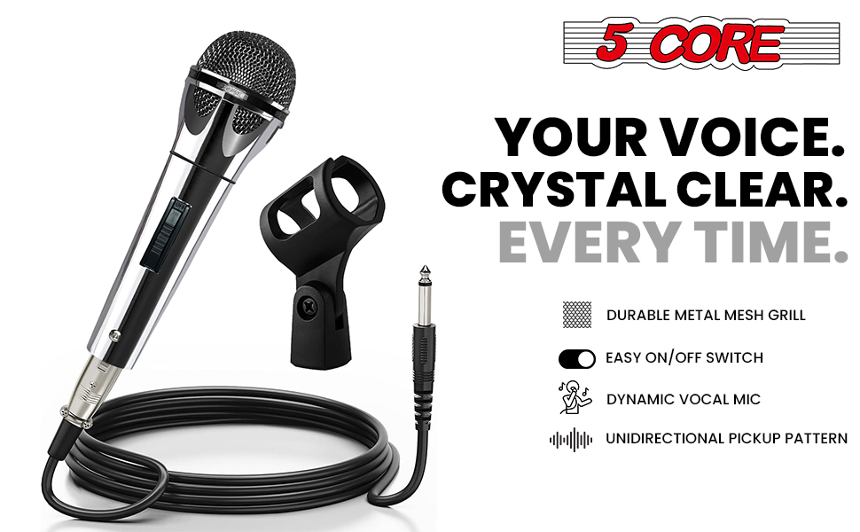 Product DescriptionExperience superior audio quality with the 5 Core cardioid karaoke microphone, designed to deliver brilliant sound reproduction while reducing noise and feedback. The wide frequency response in the dynamic microfono ensures consistent sound pickup from the source and keeps its natural form. You don't need to do a lot of equalization to get the perfect sound. This is a professional vocal microphone for singing, designed to offer you clarity and amazing sound.