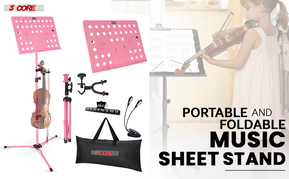 5 Core Music Stand For Sheet Music Height Adjustable Portable Folding Atril Para Partituras W Light Clip For Guitar Players Violinists Cellists Pianists - MUS FLD HD ACC PNK