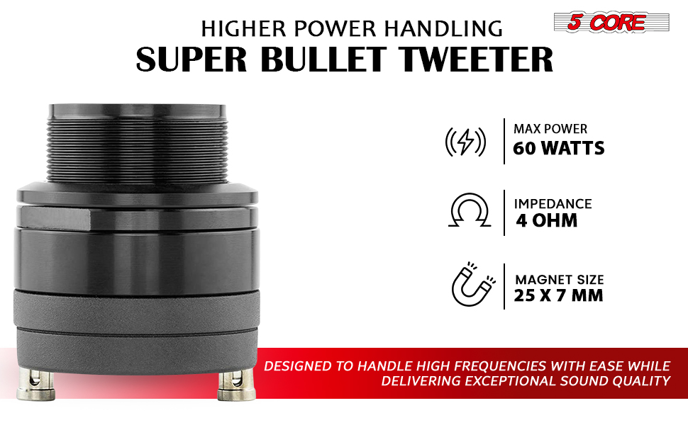 Specification Brand:5 CoreAvailable Ship to:Puerto Rico,United StatesDetailsTitanium Super Bullet Tweeter Description:Indulge in unmatched audio excellence with our Super Bullet Tweeter, equipped...