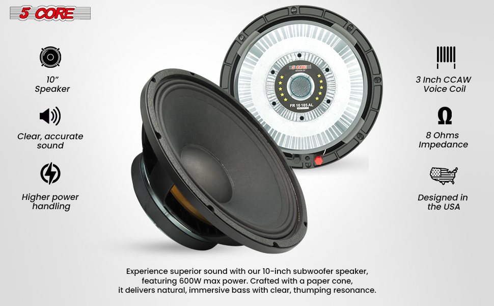 5CORE 10 Inch Subwoofer Speaker 600W 8 Ohm Full Range Replacement DJ Bass Sub Woofer Loudspeaker 3" Voice Coil 96 Oz Magnet Aluminum Frame