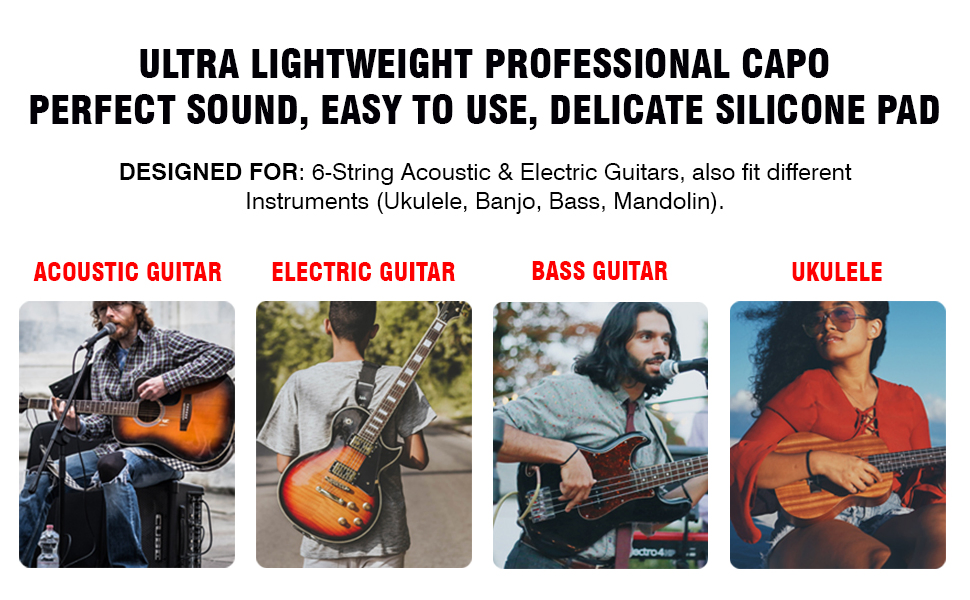 Experience effortless play with our Capo for 6 string acoustic electric guitars, banjos, mandolins, and ukuleles. Quick release functionality allows seamless fret changes with one hand, ensuring no interruption to your performance. Made with premium metal alloy for durability, it features a soft silicone pad to protect your instrument from scratches.
