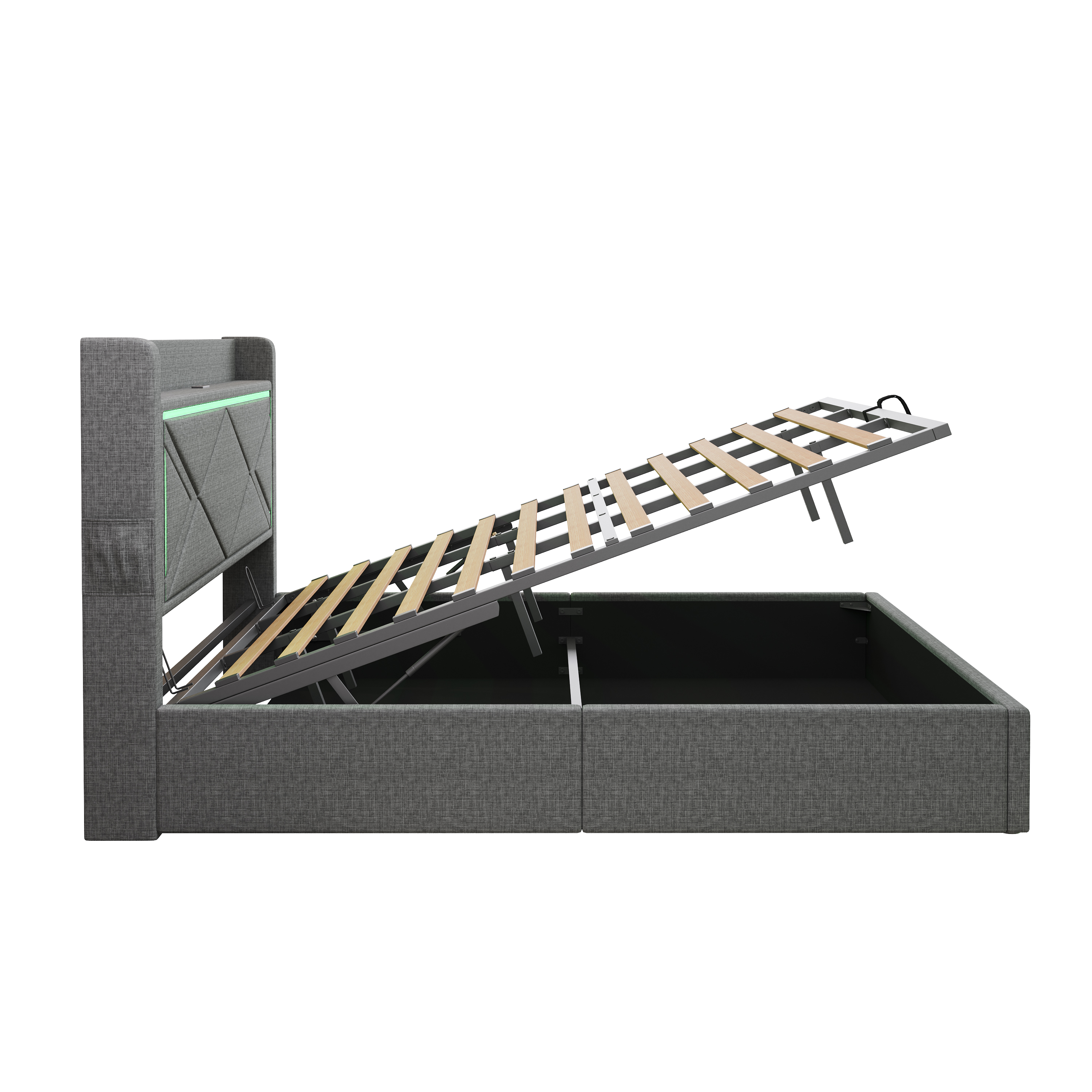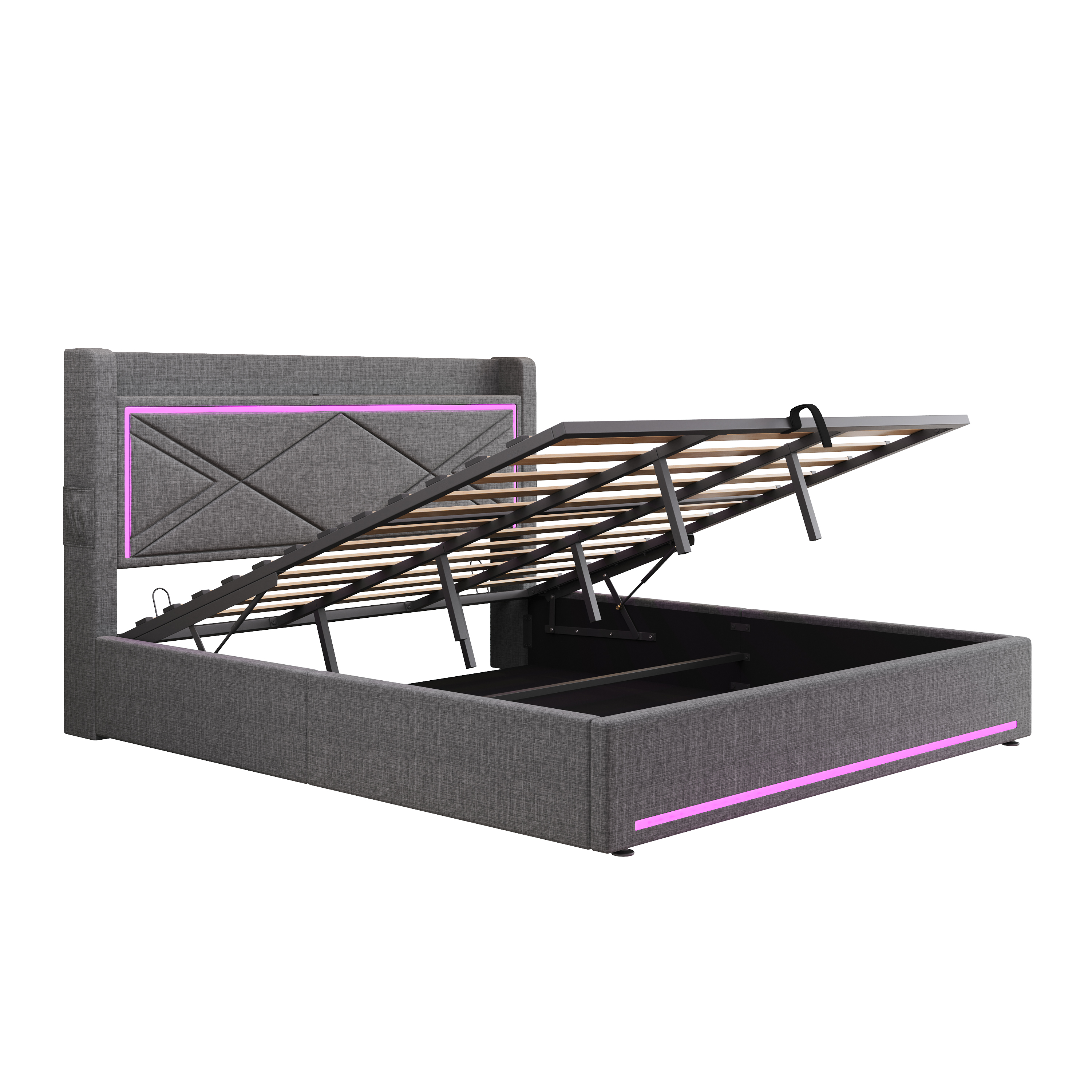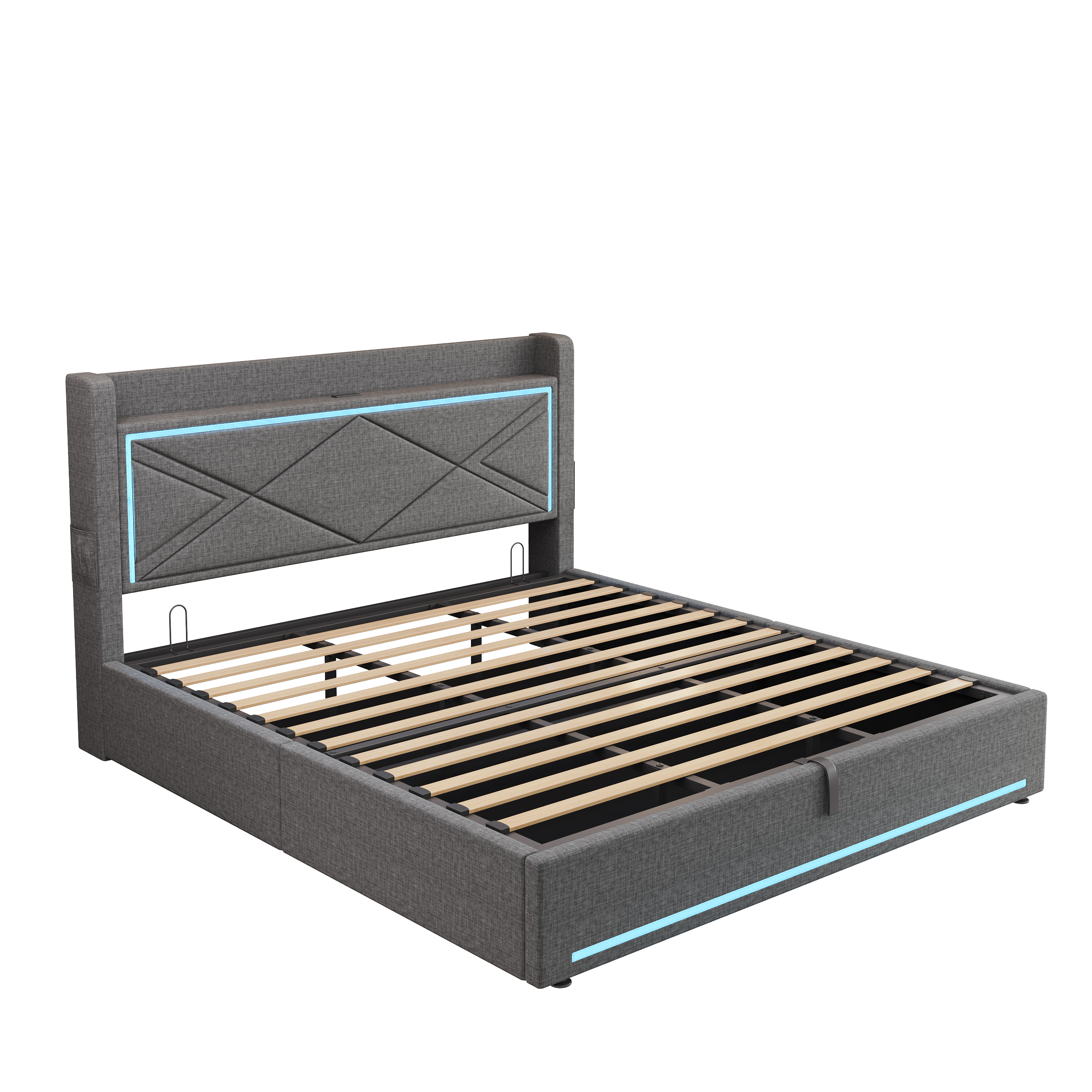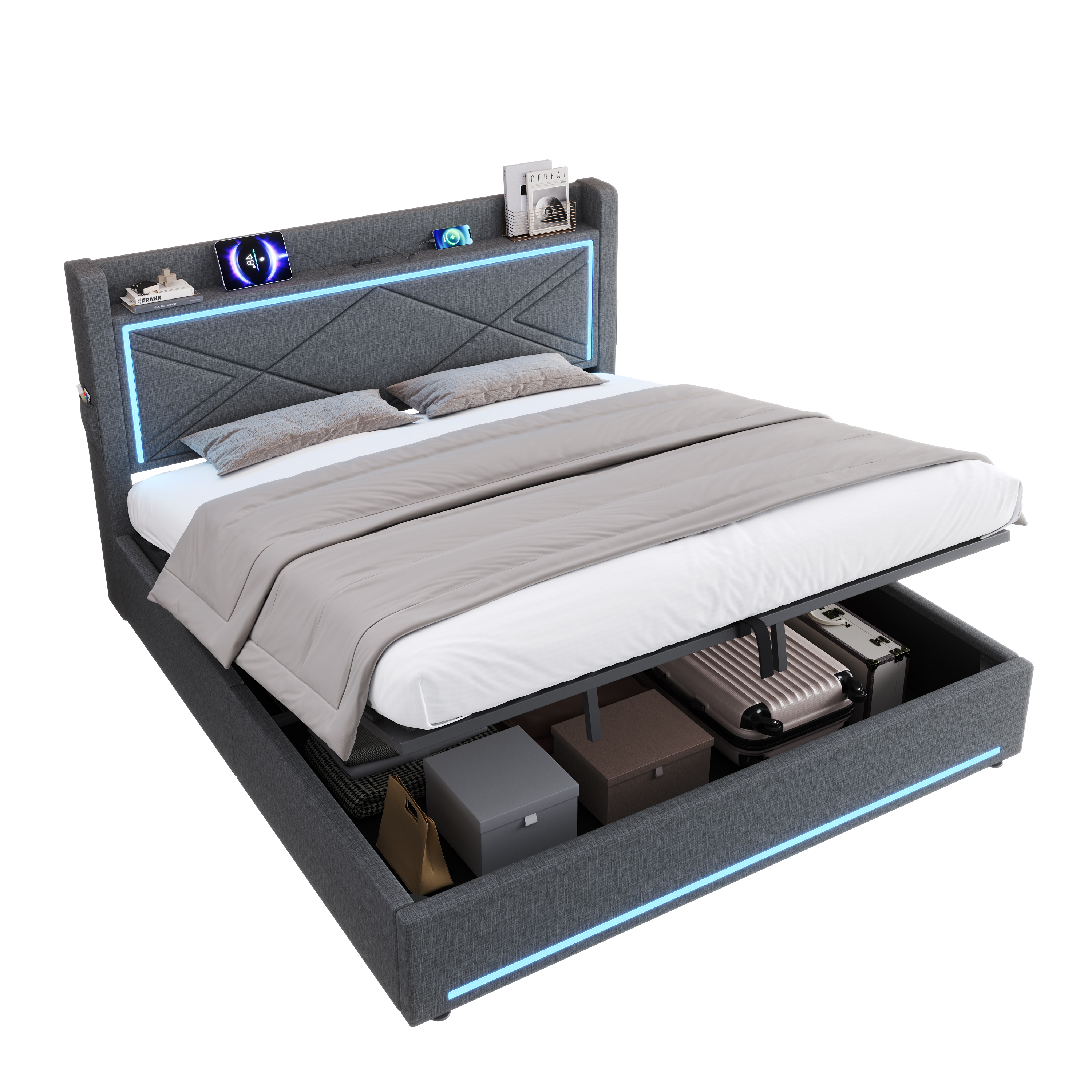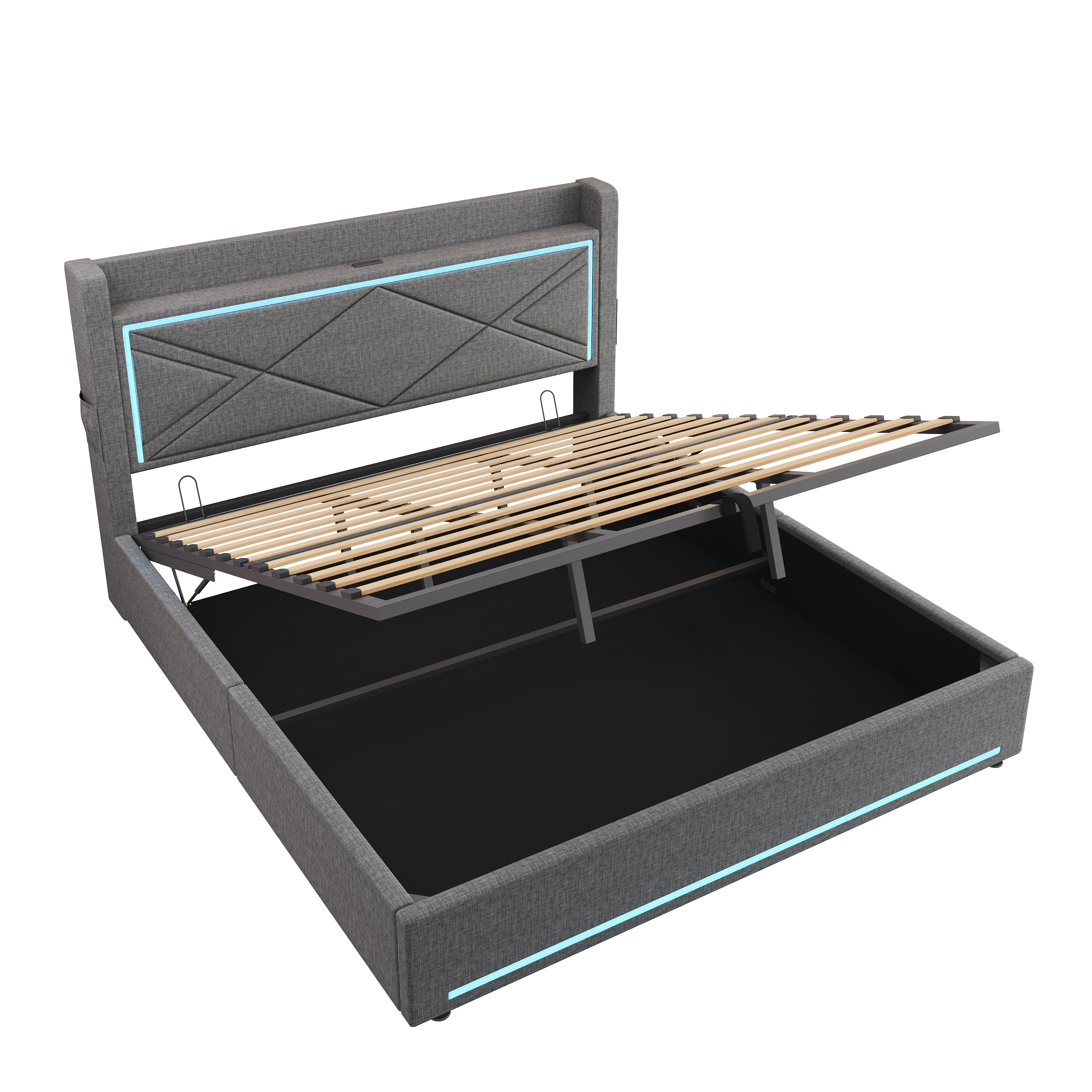 Product Name:6ft Super King Upholstered Bed Frame with Hydraulic Storage, Linen Ottoman Bed with LED Lighting and Charging Station, USB and Type - C Ports, No Box Spring Needed, Grey (No Mattress)