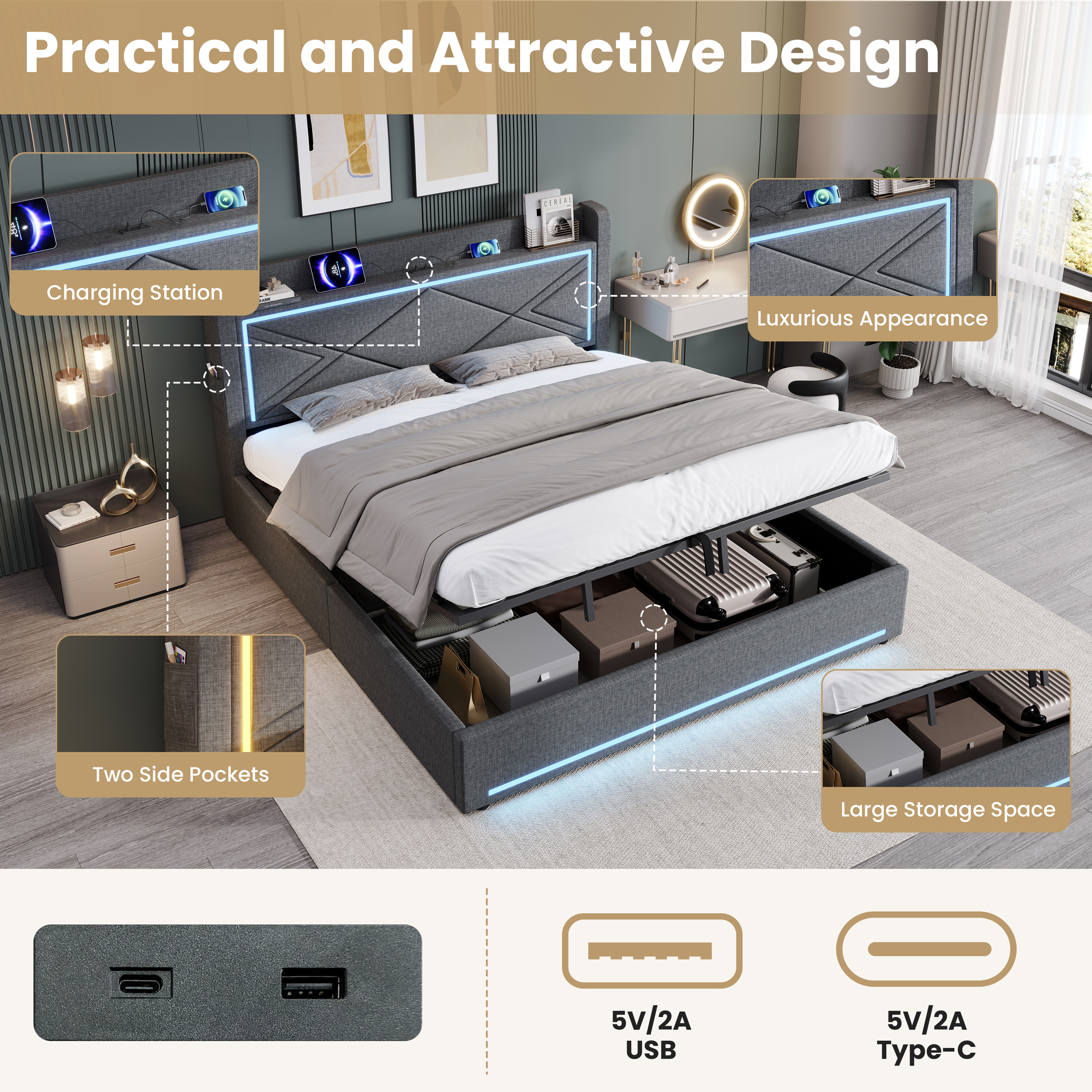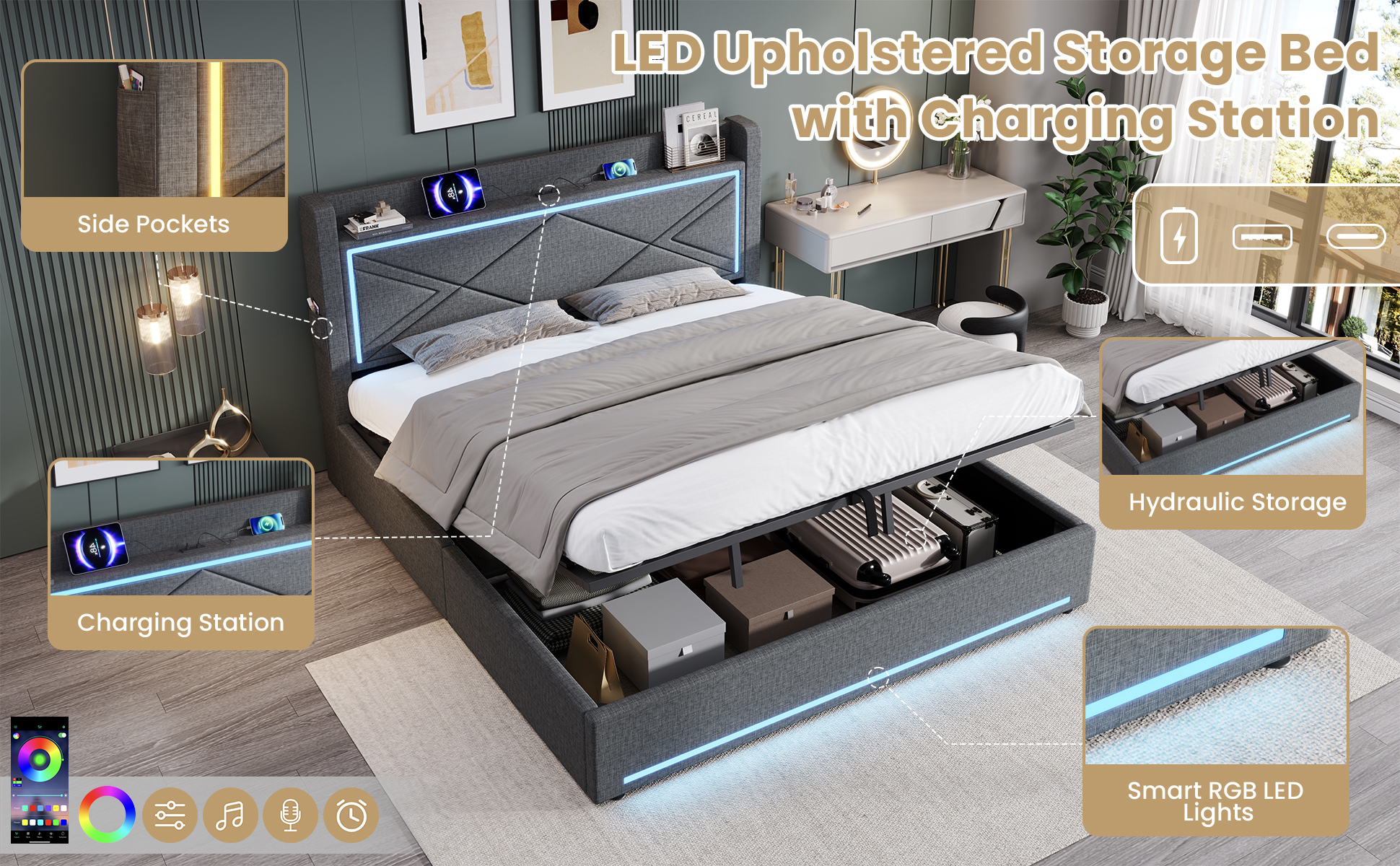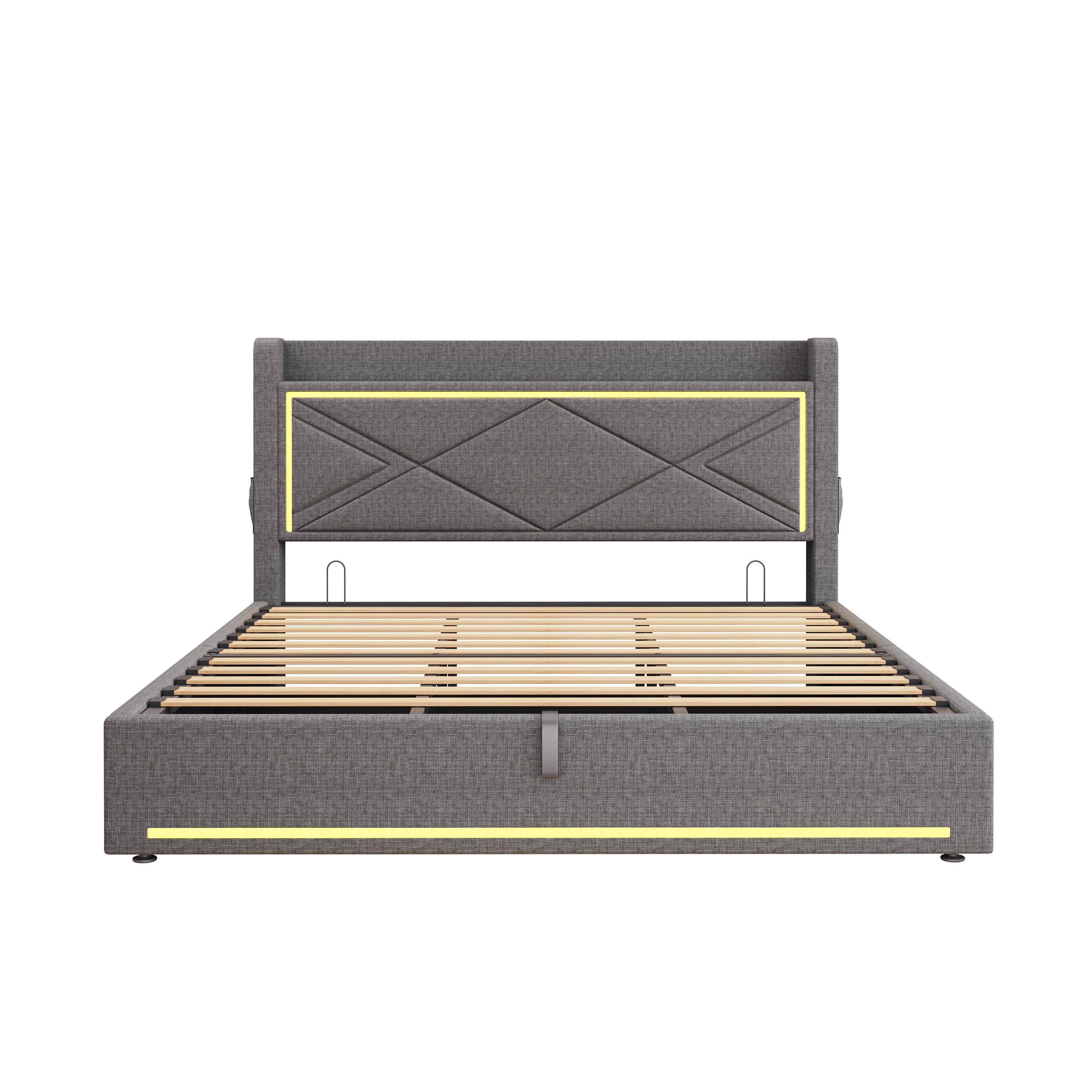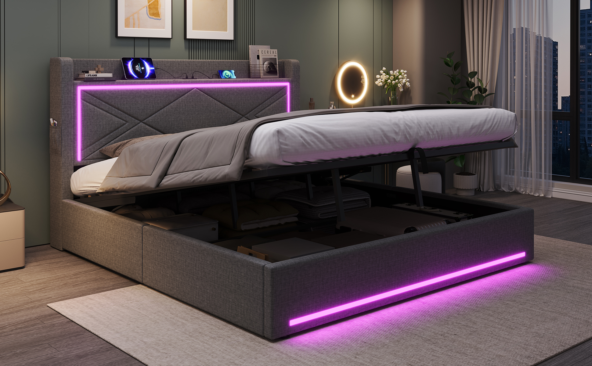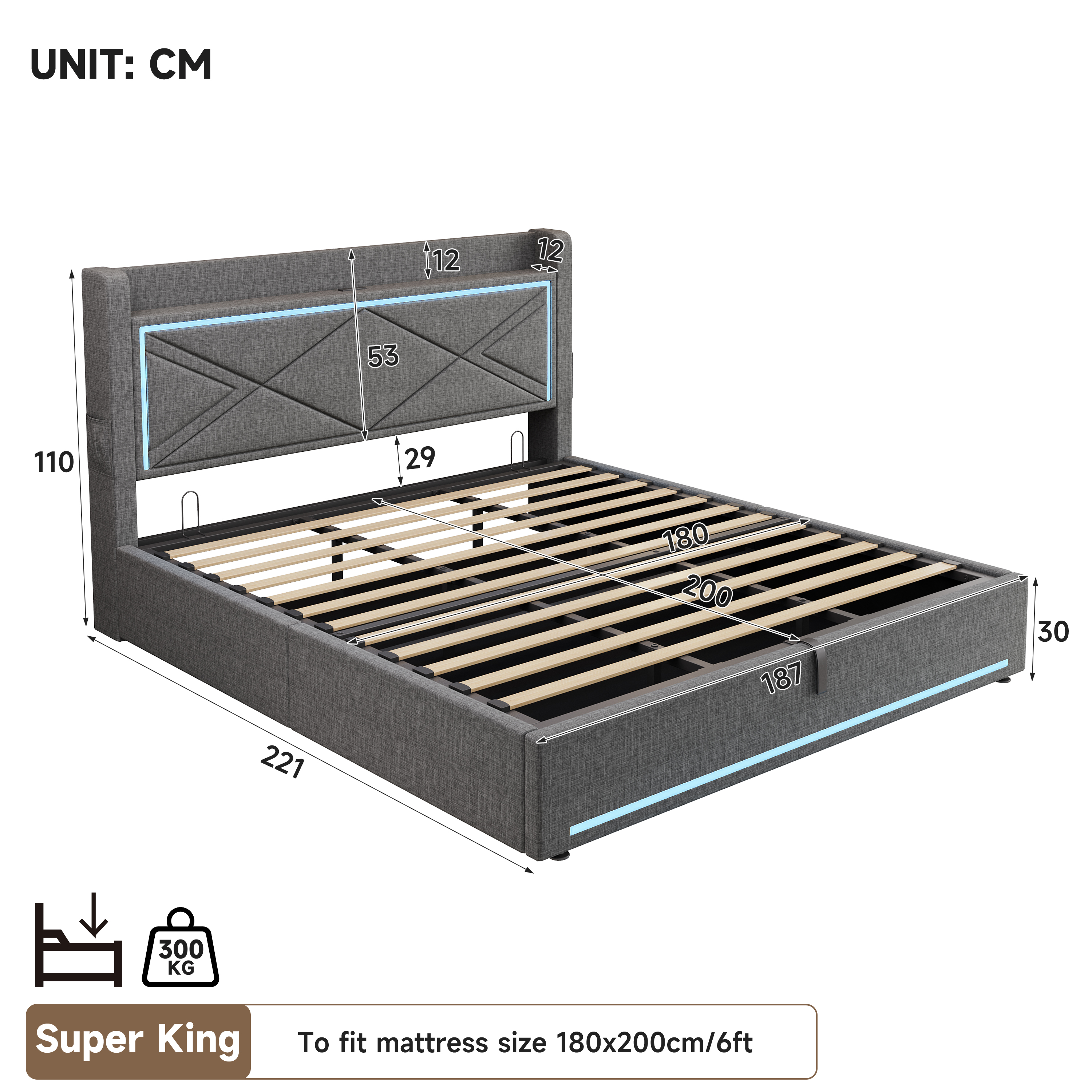Product Name:6ft Super King Upholstered Bed Frame with Hydraulic Storage, Linen Ottoman Bed with LED Lighting and Charging Station, USB and Type - C Ports, No Box Spring Needed, Grey (No Mattress)