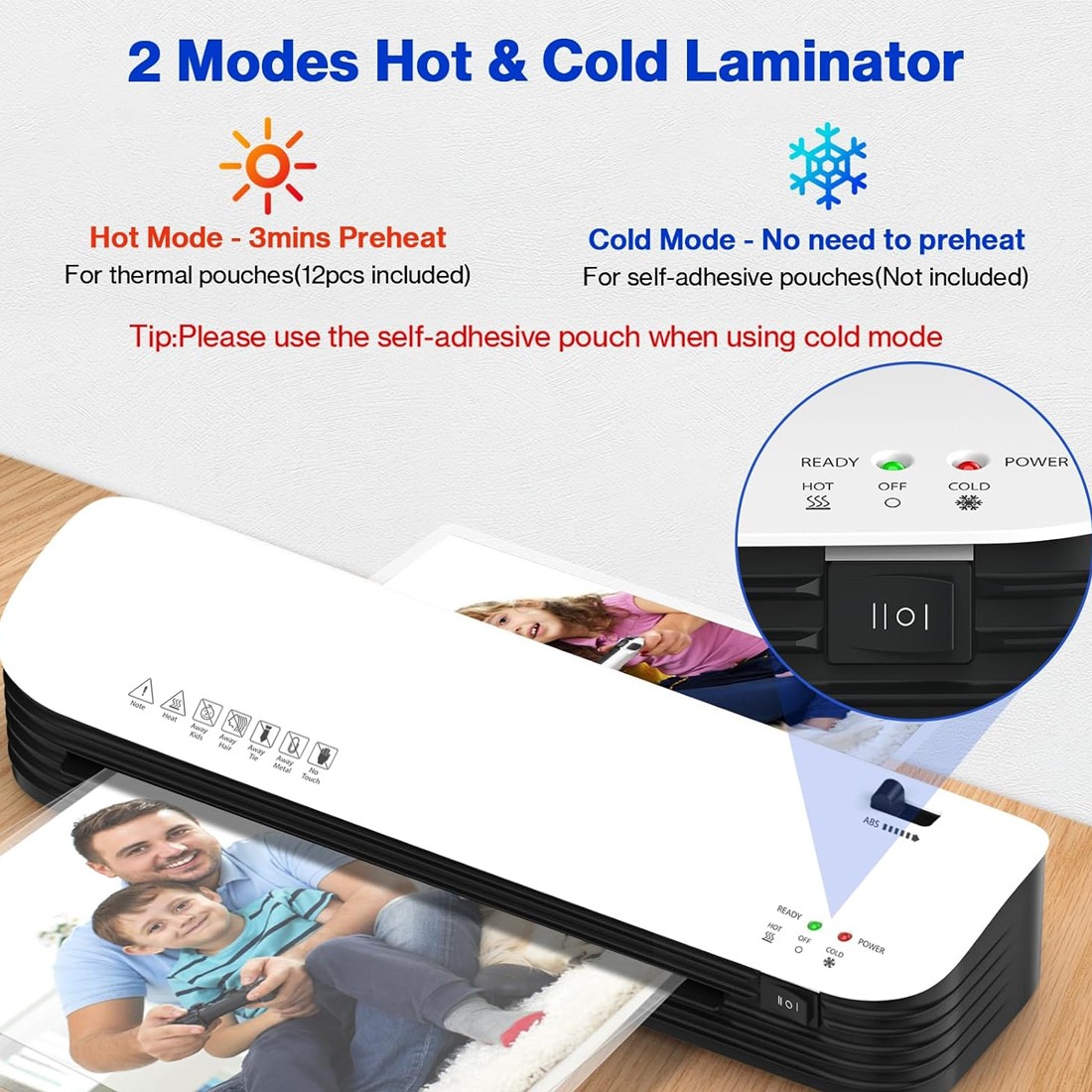 【Hot & Cold System Options】There are two laminating ways, thermal and cold laminating mode. They are perfect for different types of laminating pouches. The Hot mode only takes 3 minutes to warm up, definitely a time-saving choice.And the cold mode is great for some special old pictures and documents