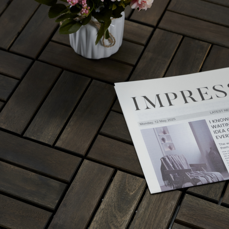 Specification Product Information Item Code:W2391P287689 Product Type :Single Box Product Product Name:Acacia Wood Interlocking Deck Tiles Checker Pattern, 30 PCS 12" x 12" Dark Brown Square Aca...