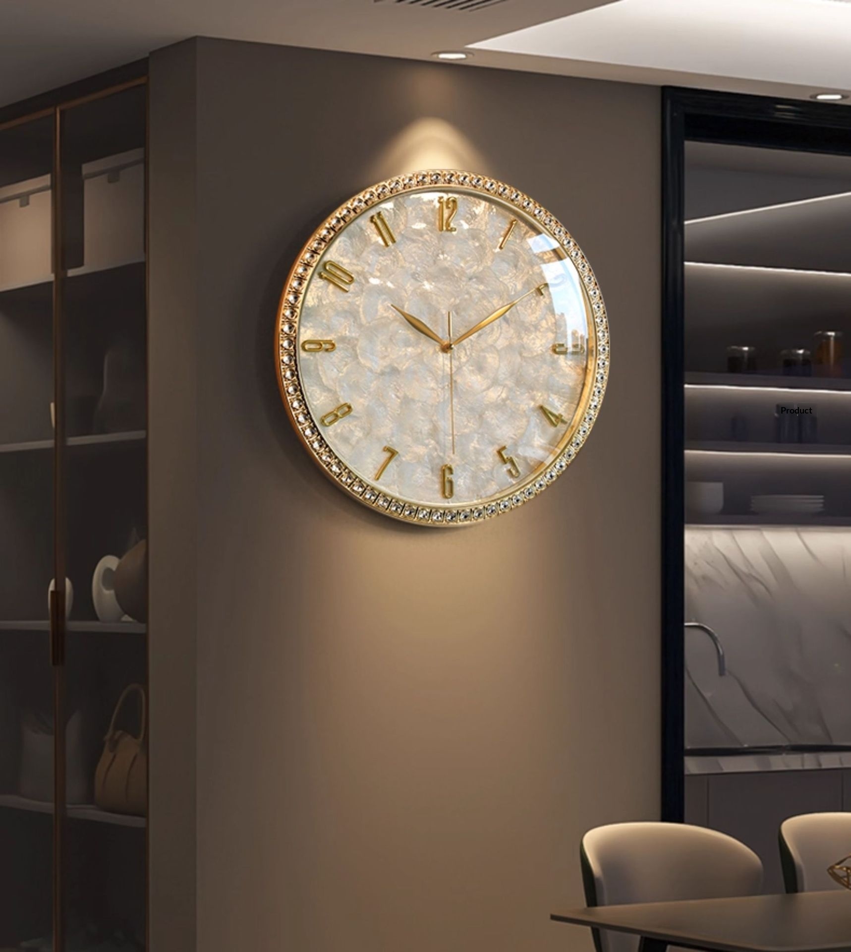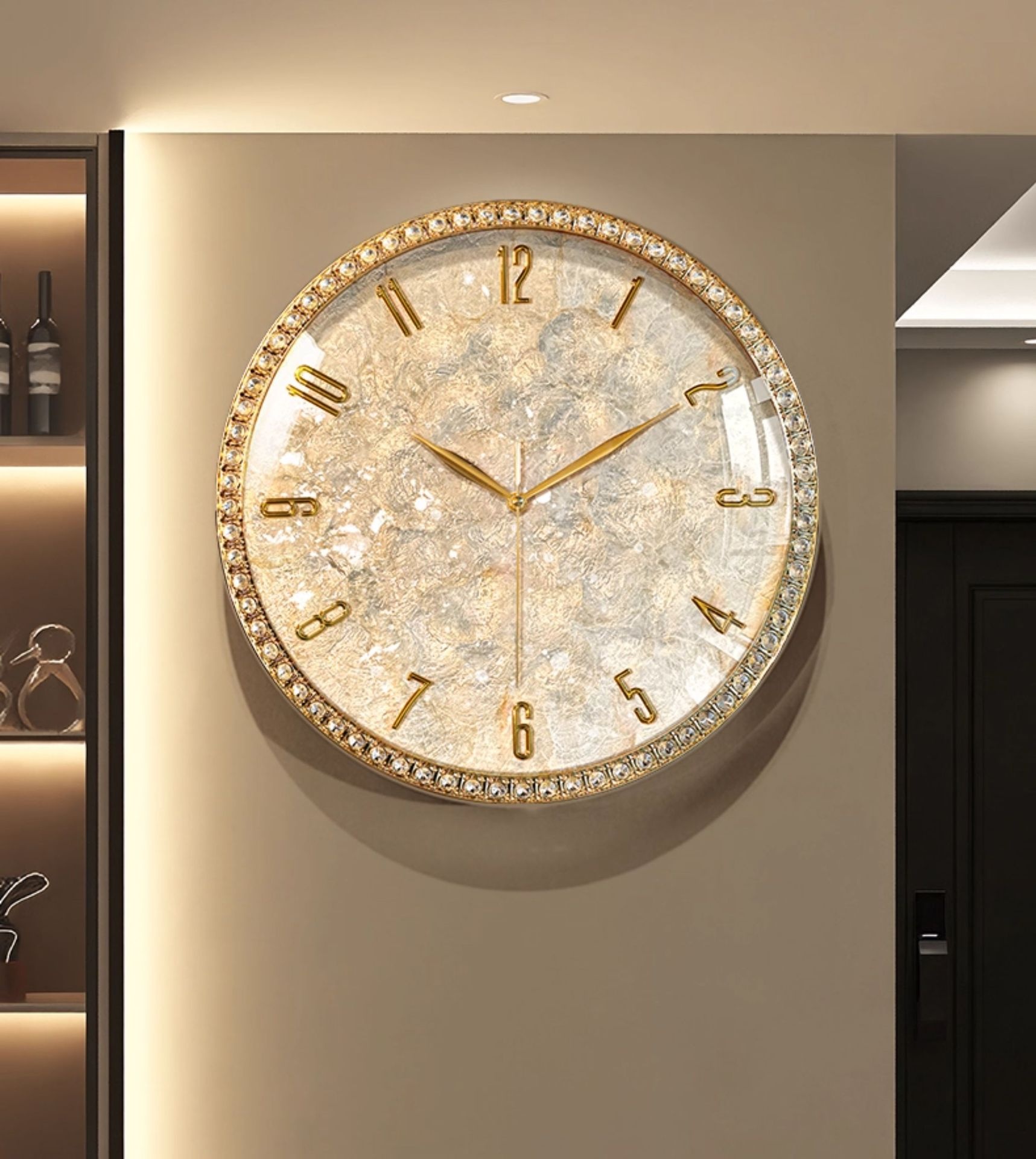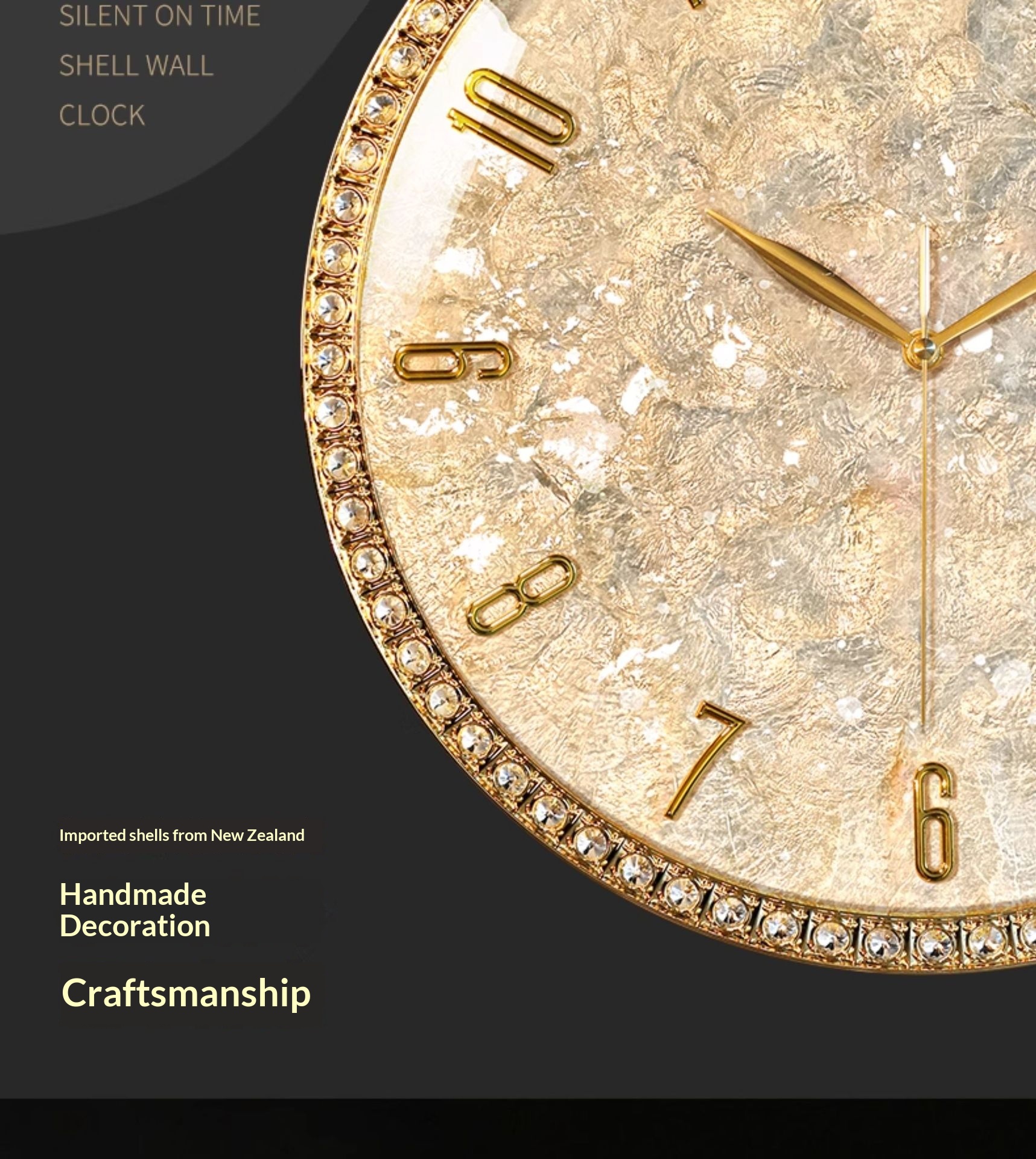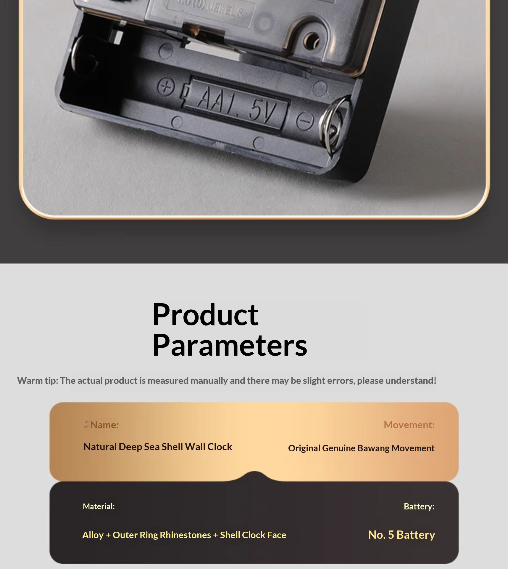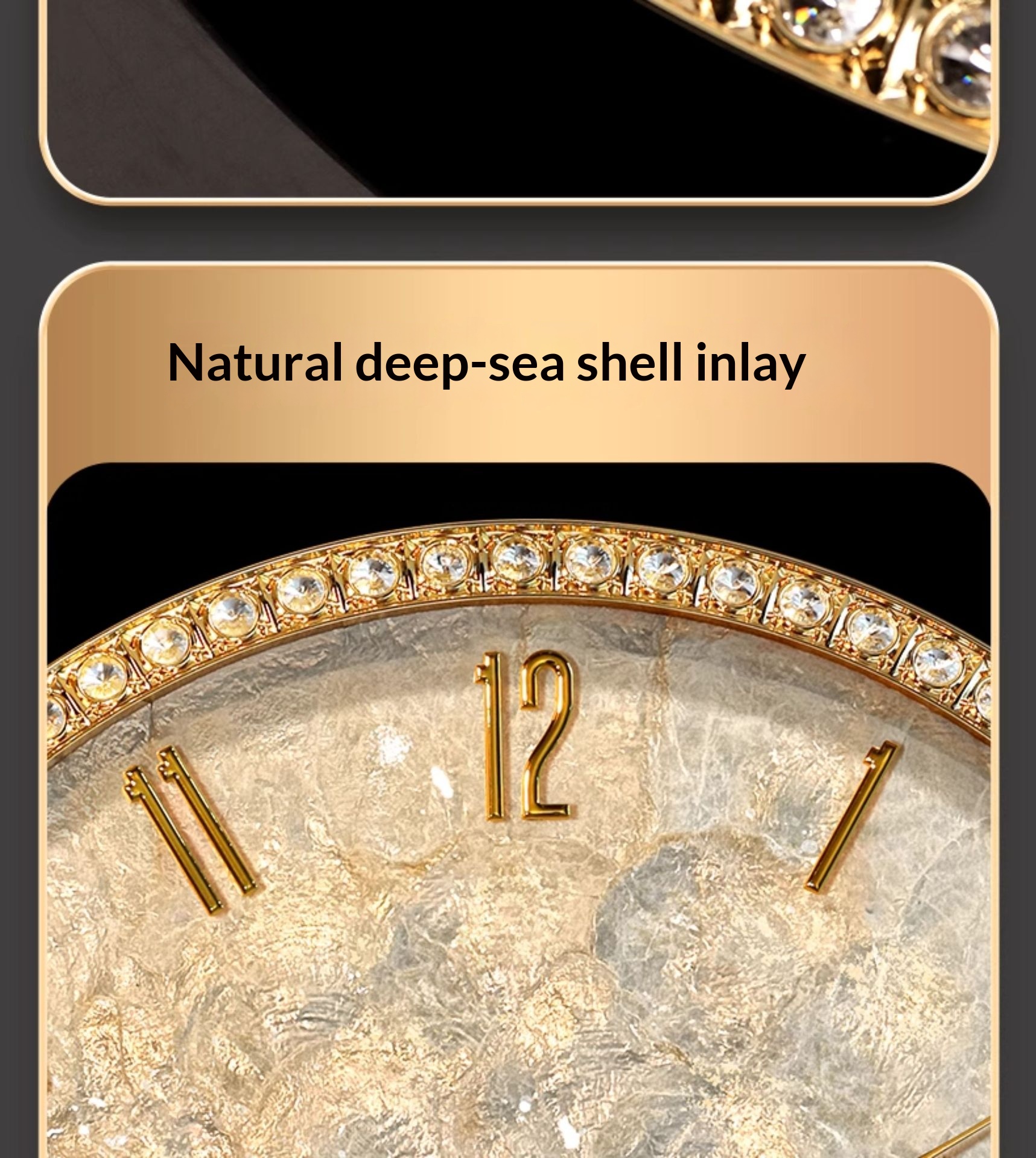 Dimensions: Rhinestone version — 18 inches; Rhinestone version — 18 inches — perpetual calendar — automatic time synchronization; White diamond version A — 16 inches; Pink diamond version A — 16 inches; White diamond version B — 16 inches; Pink diamond version B — 16 inches; Black walnut wood version — 16 inches; Alloy version — 16 inches; Colorful mother-of-pearl version — 16 inches;