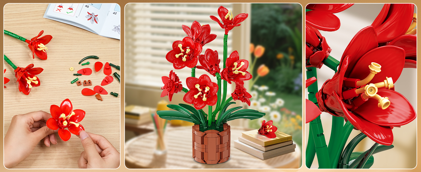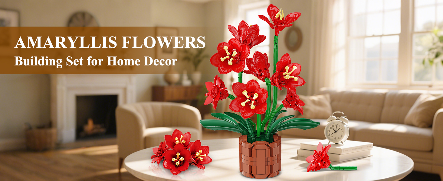 AMARYLLIS FLOWER BUILDING SET - Bring everlasting beauty into your home with this lifelike amaryllis flower bouquet set, featuring 8 vibrant blooms and lush green leaves in a stylish pot. More th...