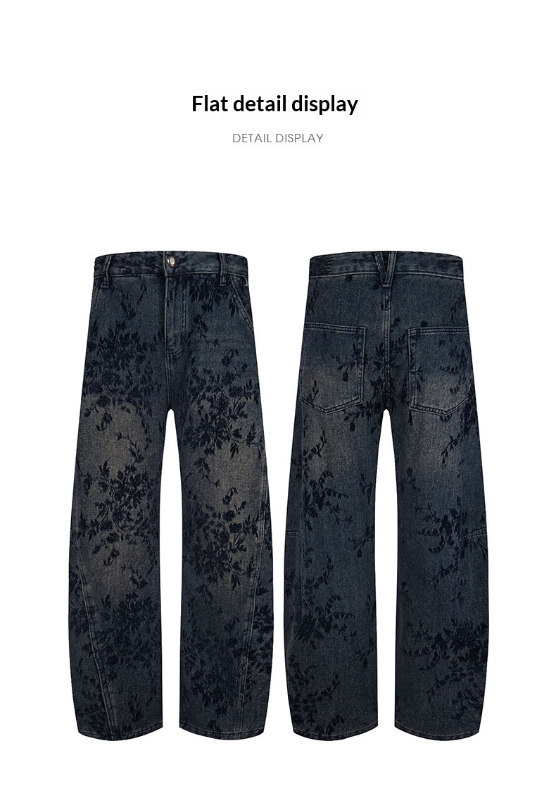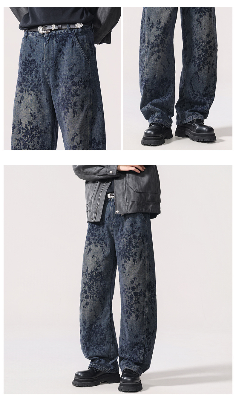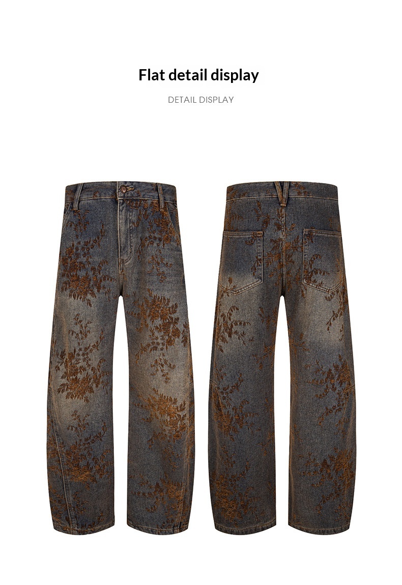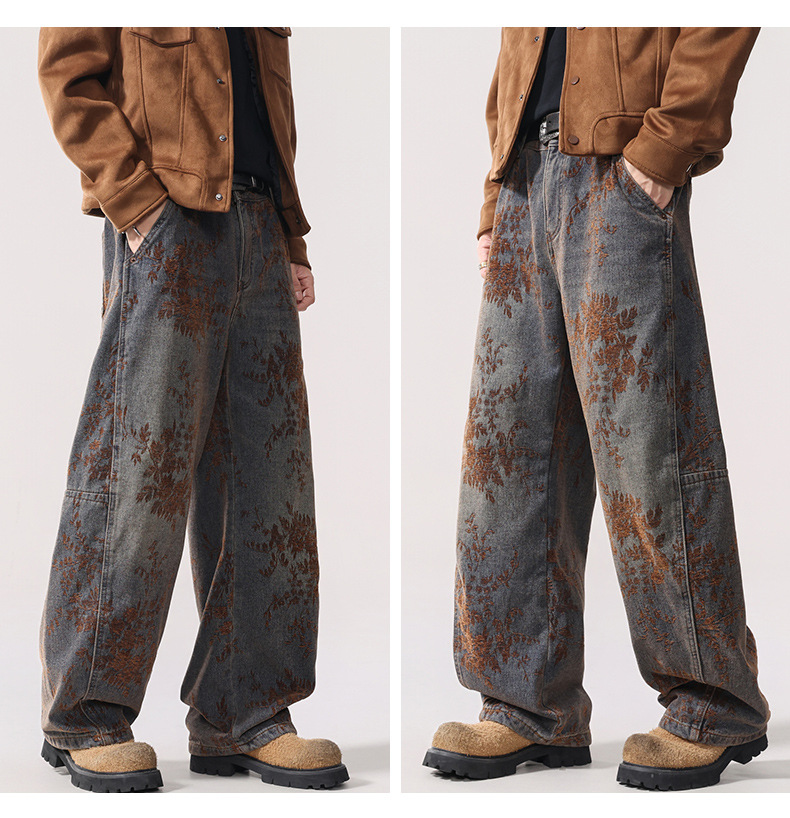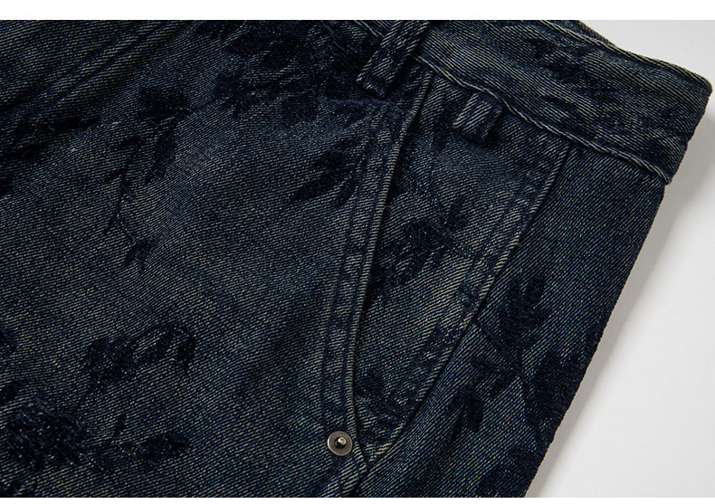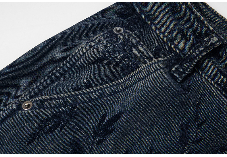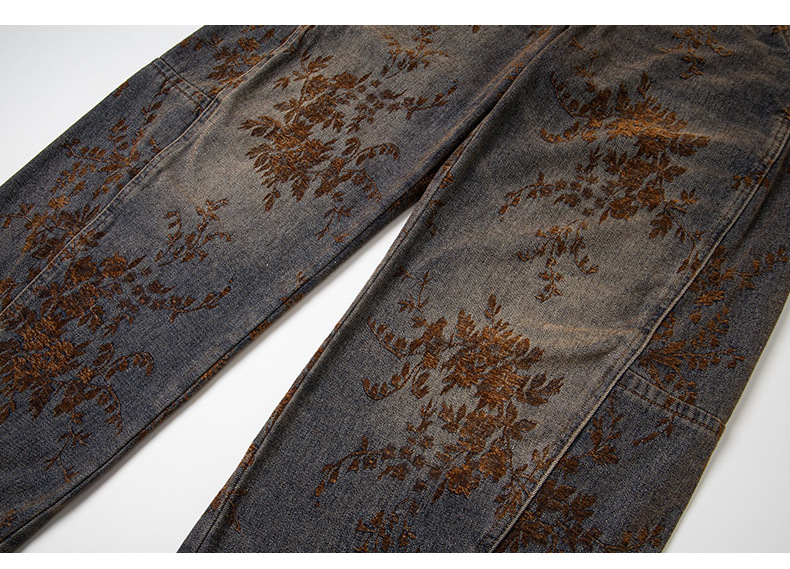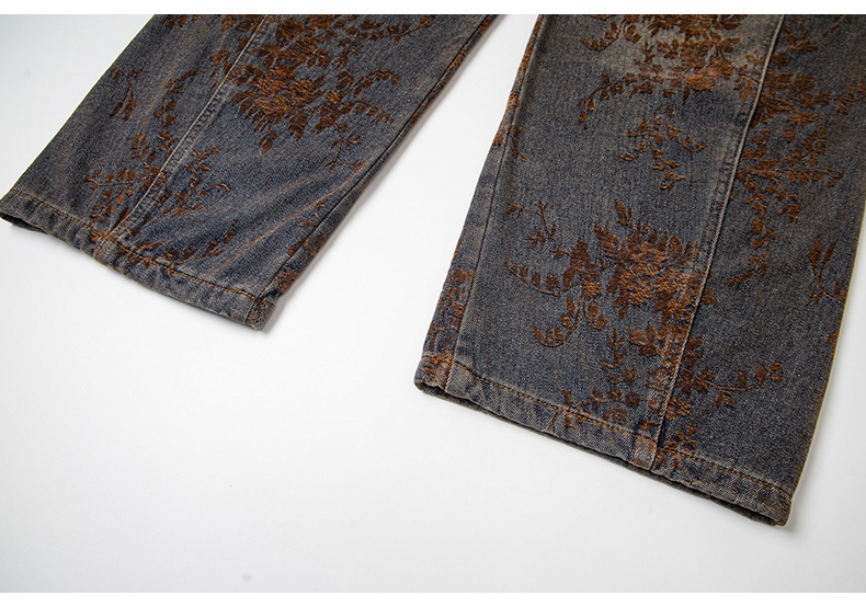 American-style Vintage Jacquard Flocking Embroidered Fleece-lined Jeans