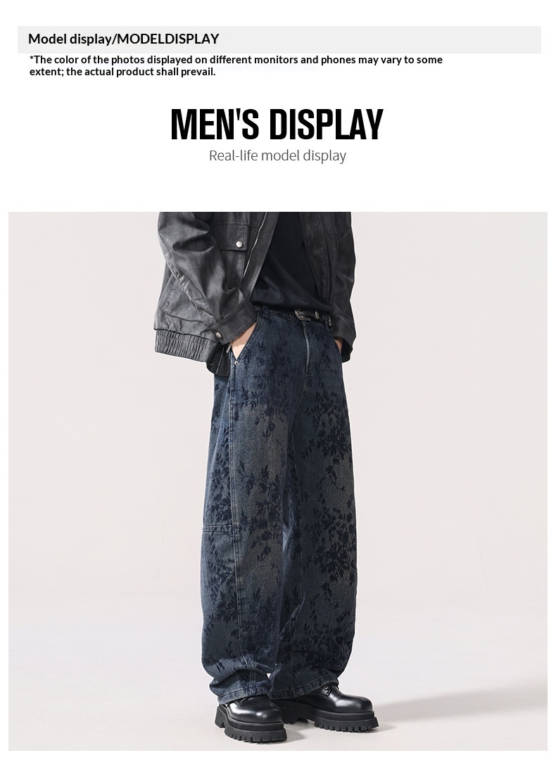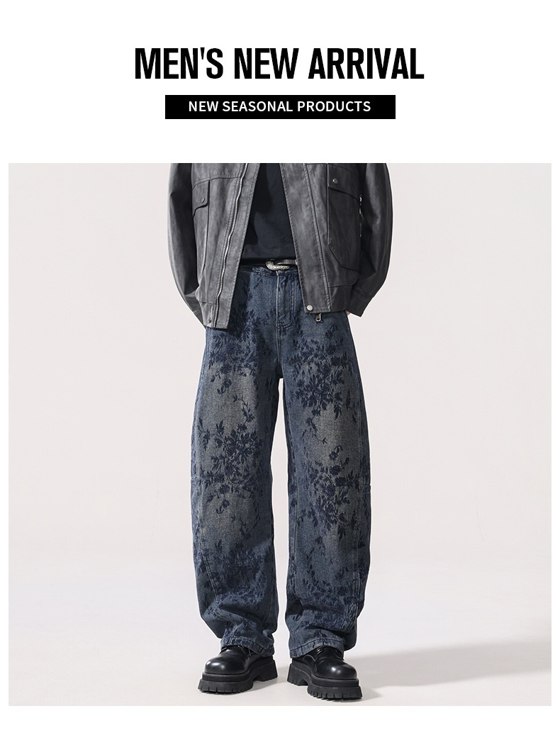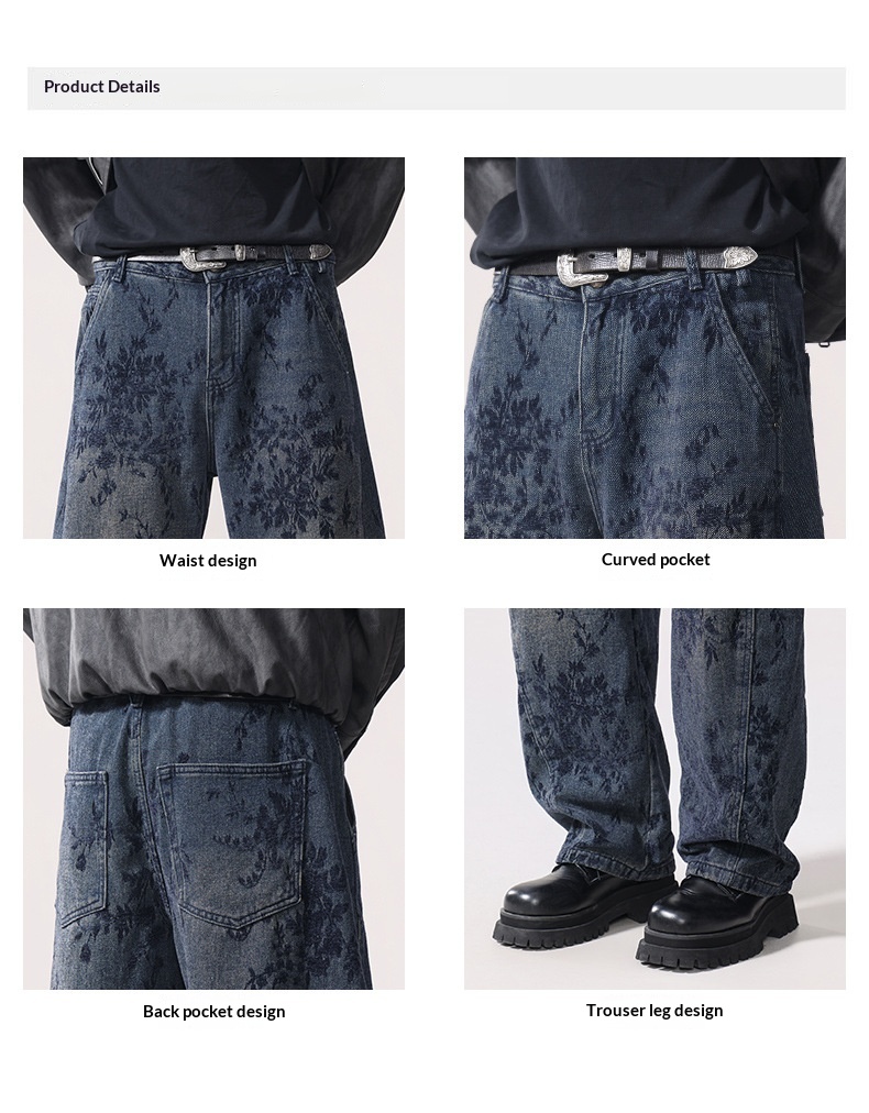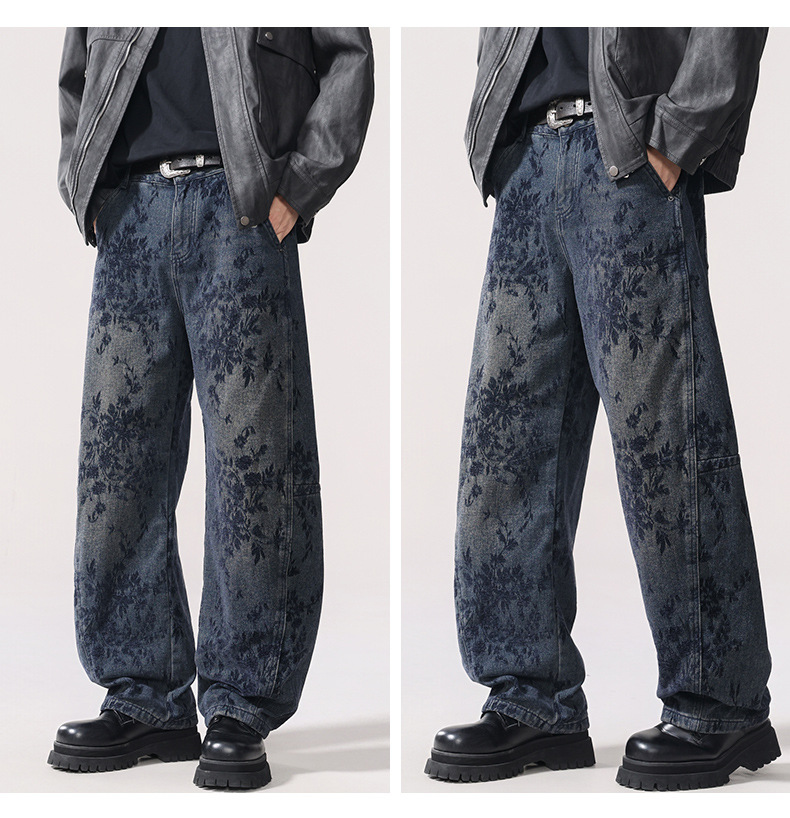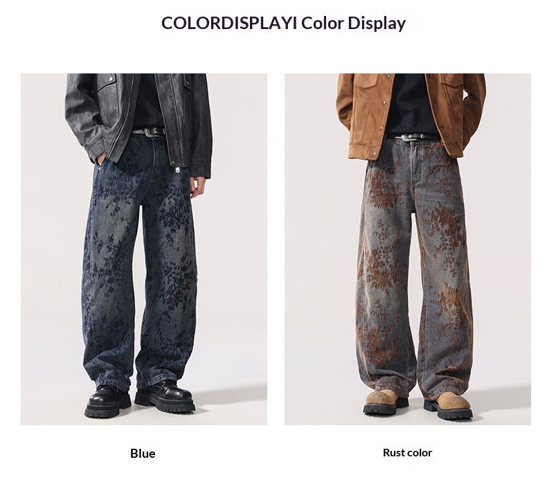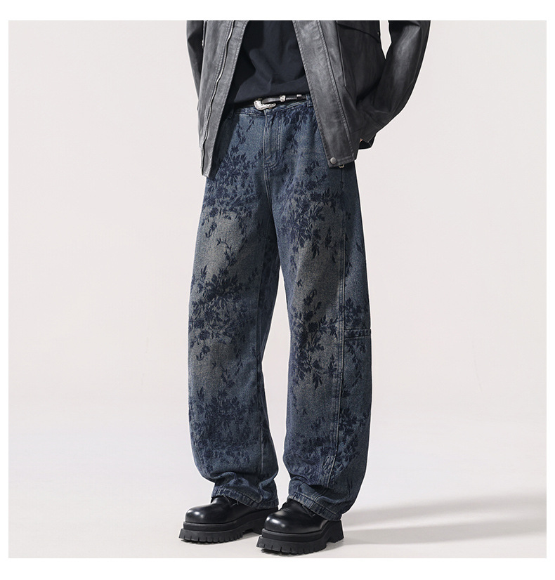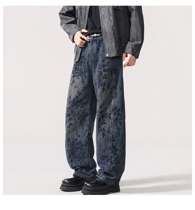 American-style Vintage Jacquard Flocking Embroidered Fleece-lined Jeans