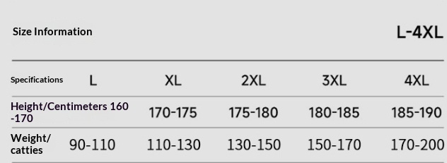 Sizes: L/90–110 jin, XL/110–130 jin, 2XL/130–150 jin, 3XL/150–170 jin, 4XL/170–200 jin