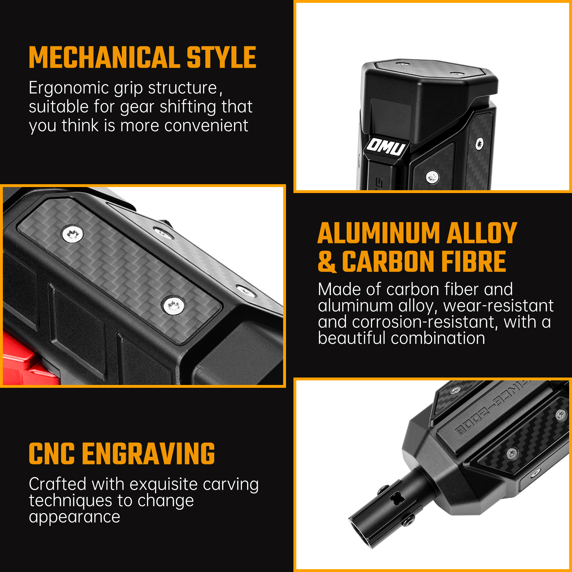 - CARBON FIBER EMBELLISHMENT On the basis of aluminum alloy, carbon fiber elements are added for embellishment. Carbon fiber is known for its high strength and stylish appearance, making the gear lever visually more impactful.