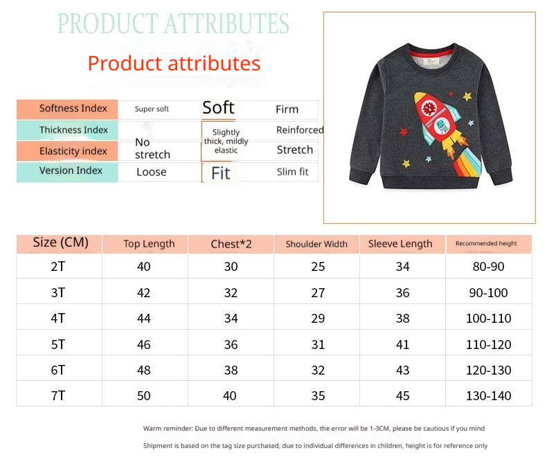 Suitable Height: 2T—recommended height 80–90 cm; 3T—recommended height 90–95 cm; 4T—recommended height 95–100 cm; 5T—recommended height 100–110 cm; 6T—recommended height 110–120 cm; 7T—recommended height 120–130 cm