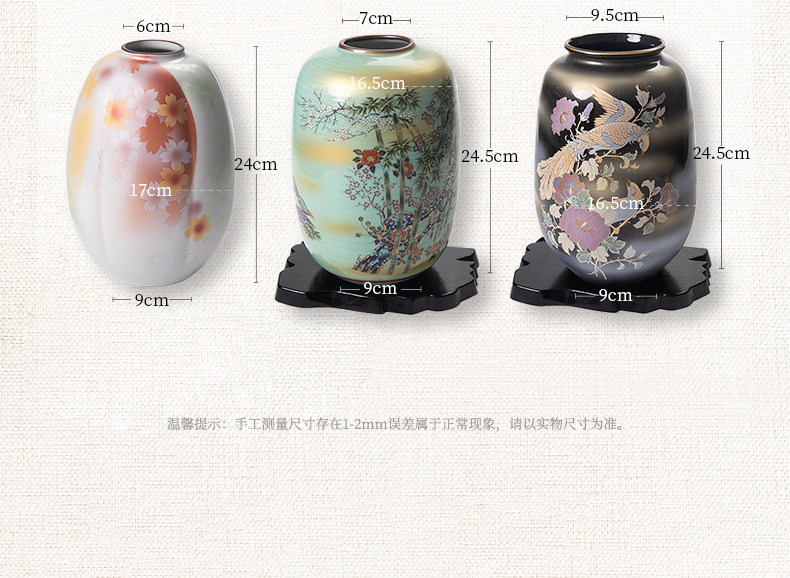 Color Variations: Blue Granule Vase, Tenmoku Phoenix Kiyomizu-yaki Vase, Peony Vase, Flower and Bamboo Kiyomizu-yaki Vase, No. 8 Vase with Golden Clouds on a Wooden Base, Gold Arabesque Vase, Floral Vase