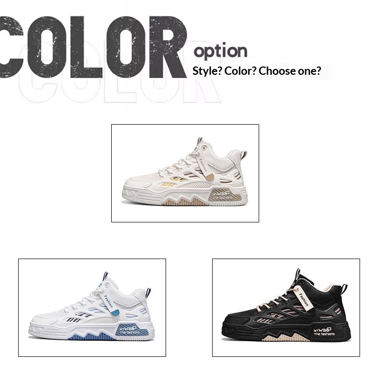 Product information:Pattern: Color-block Lining material: Mesh fabric Applicable sports: Universal Colors: Beige, white and blue, black Shaft height: High-top Heel height: Low heel (1–3 cm) Heel shape...