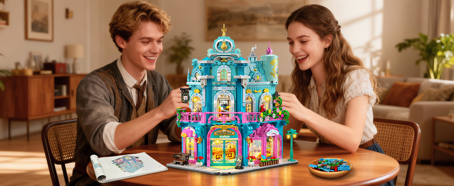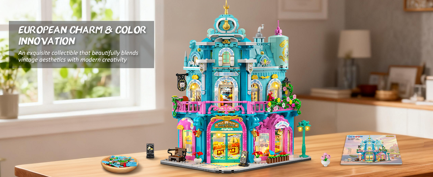 European Charm Meets Color Innovation - This city dairy shop building set showcases classic European architecture, featuring a signature steep roof, arched carved windows, and lush, floral greenery, which elegantly recreates the romance of European streets. The design innovatively pairs vibrant blue and pink in a stunning color contrast, creating a perfect harmony between fresh hues and elegant structure. An exquisite collectible that beautifully blends vintage aesthetics with modern creativity
