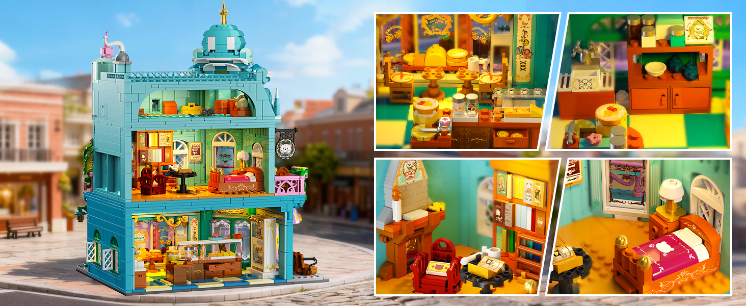 Three-Story Modular Design - Each floor detaches and reassembles for dynamic play. The ground level features an ordering counter, displays for milk, bread, and pizza, a vertical cooler, plus a dining area with sink. The second floor includes a cozy bed, fireplace, and bookshelf, while the third floor holds a chest and packages. Every level creates its own scene while combining into a complete miniature world. Don't miss this intricately detailed bakery house building kit with innovative design