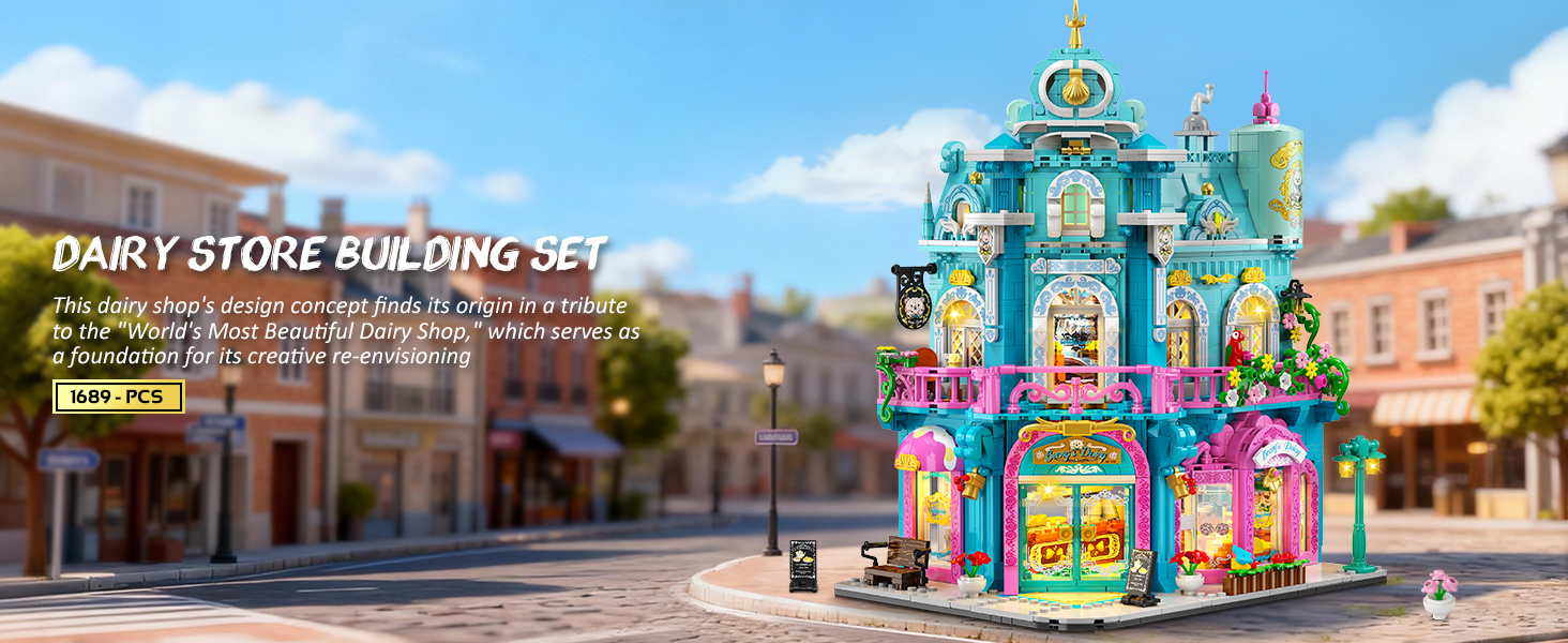 This city dairy shop building set showcases classic European architecture, featuring a signature steep roof, arched carved windows, and lush, floral greenery, which elegantly recreates the romance of European streets This city dairy shop building set showcases classic European architecture, featuring a signature steep roof, arched carved windows, and lush, floral greenery, which elegantly recreates the romance of European streets