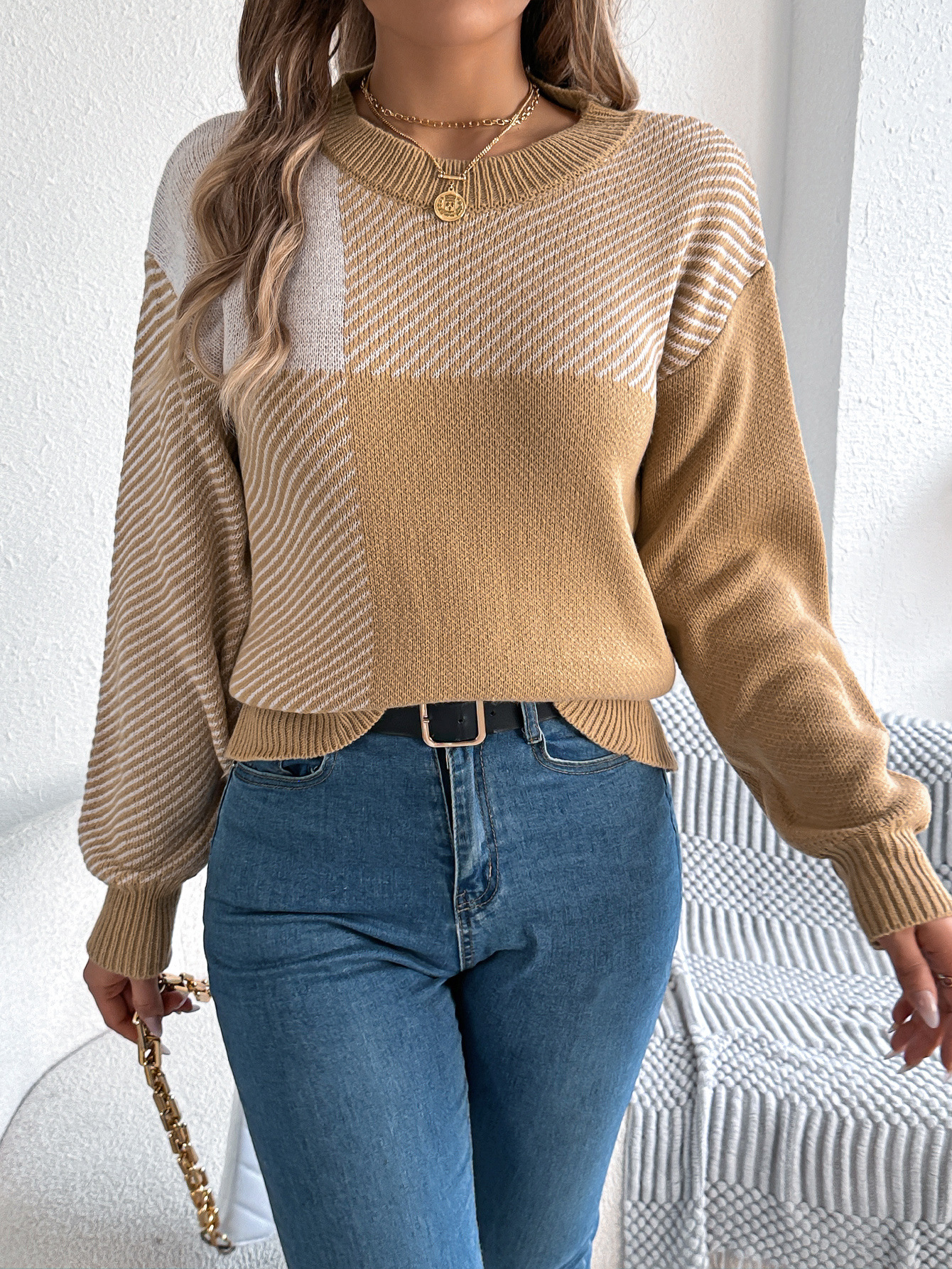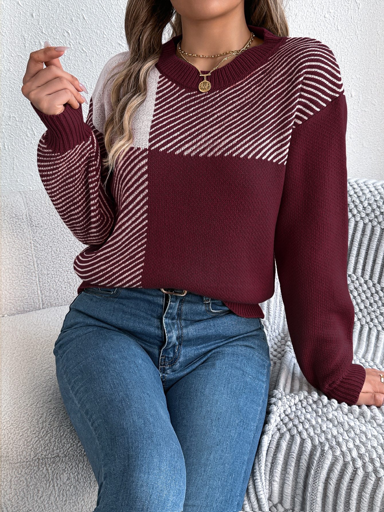 Casual Color-Block Plaid Long-Sleeve Pullover Sweater