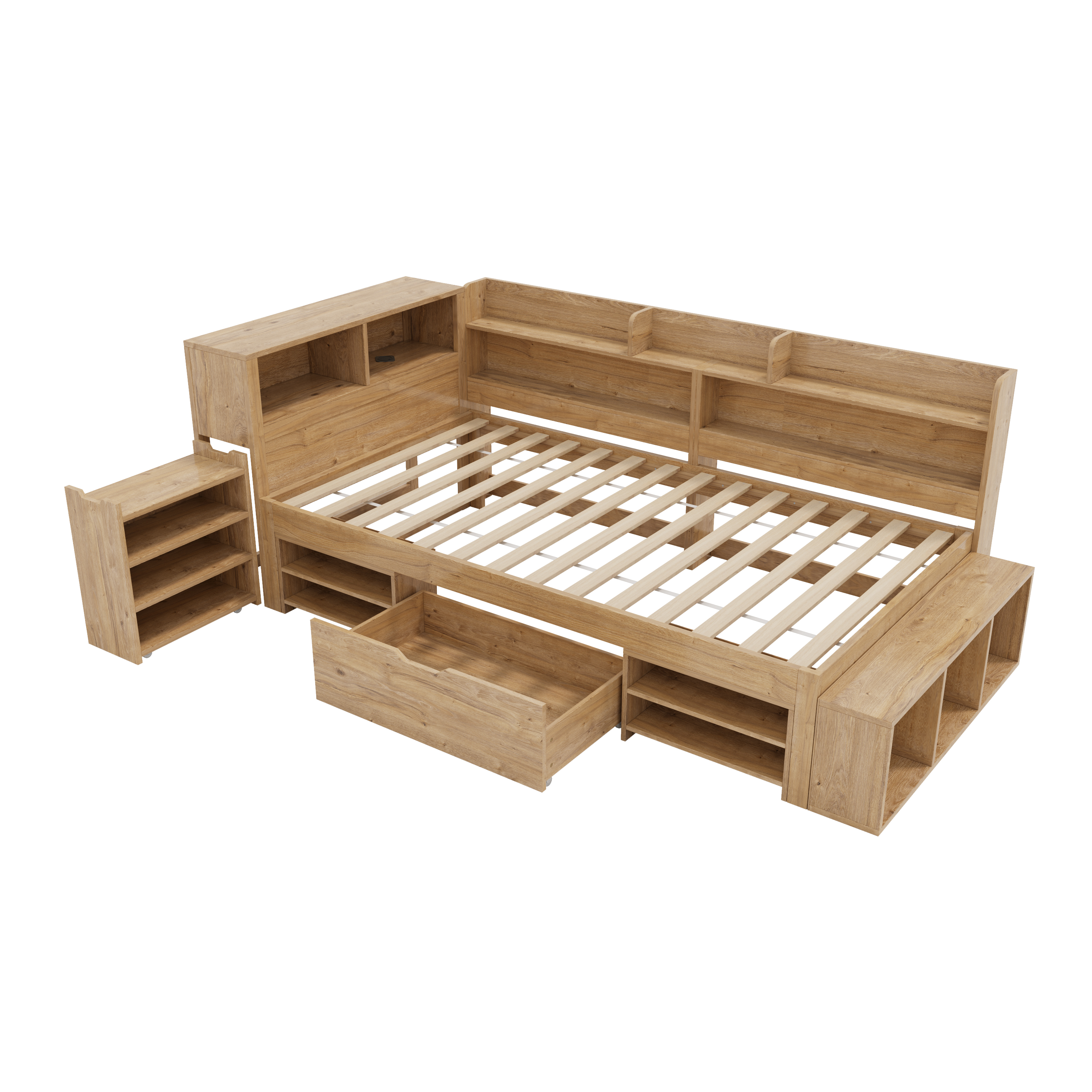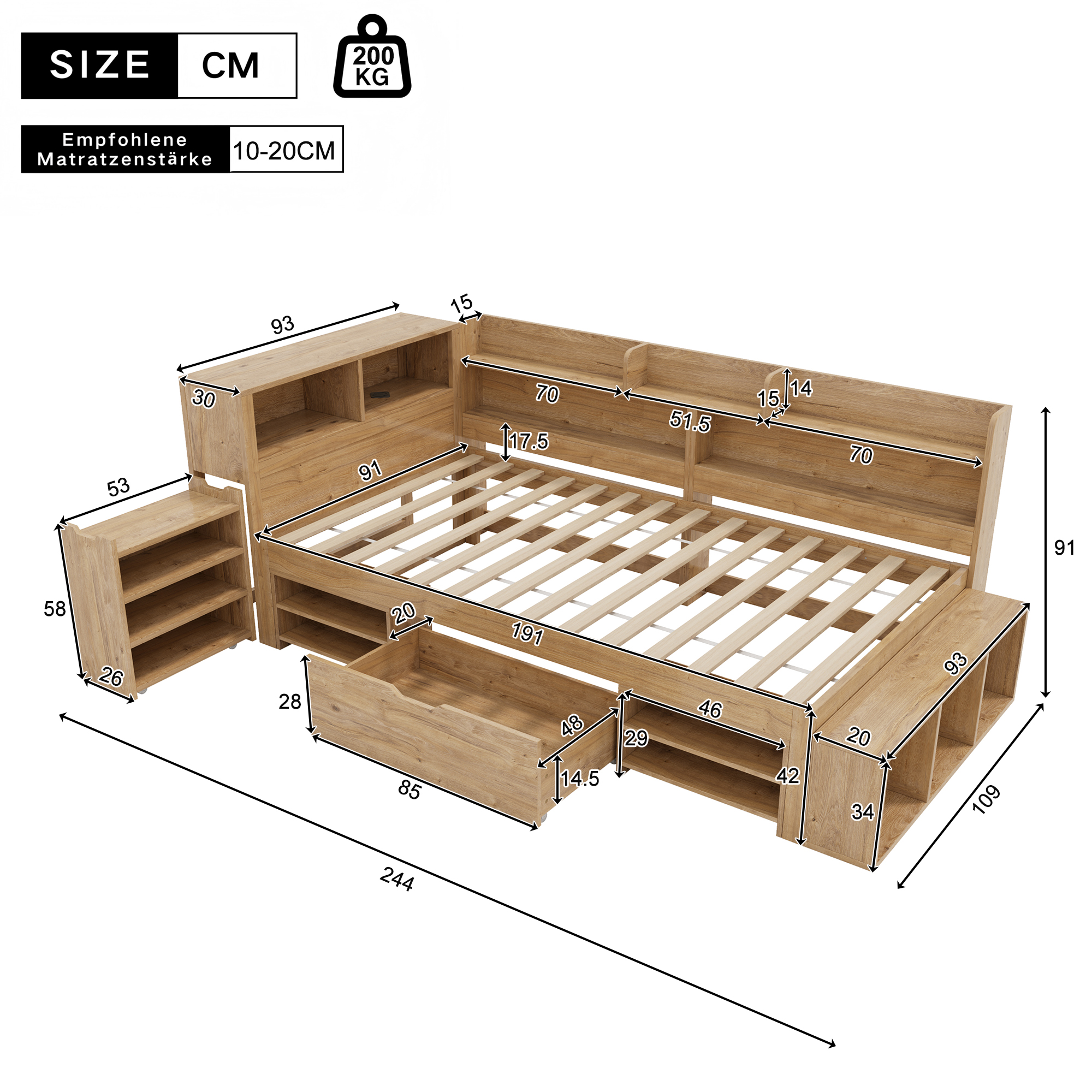 Product Name:Children's bed, Single Bed-3ft(90*190cm), single bed, multifunctional children's bed with drawers, bookcase and storage cupboard, large storage space, slatted frame, without mattress, natural color